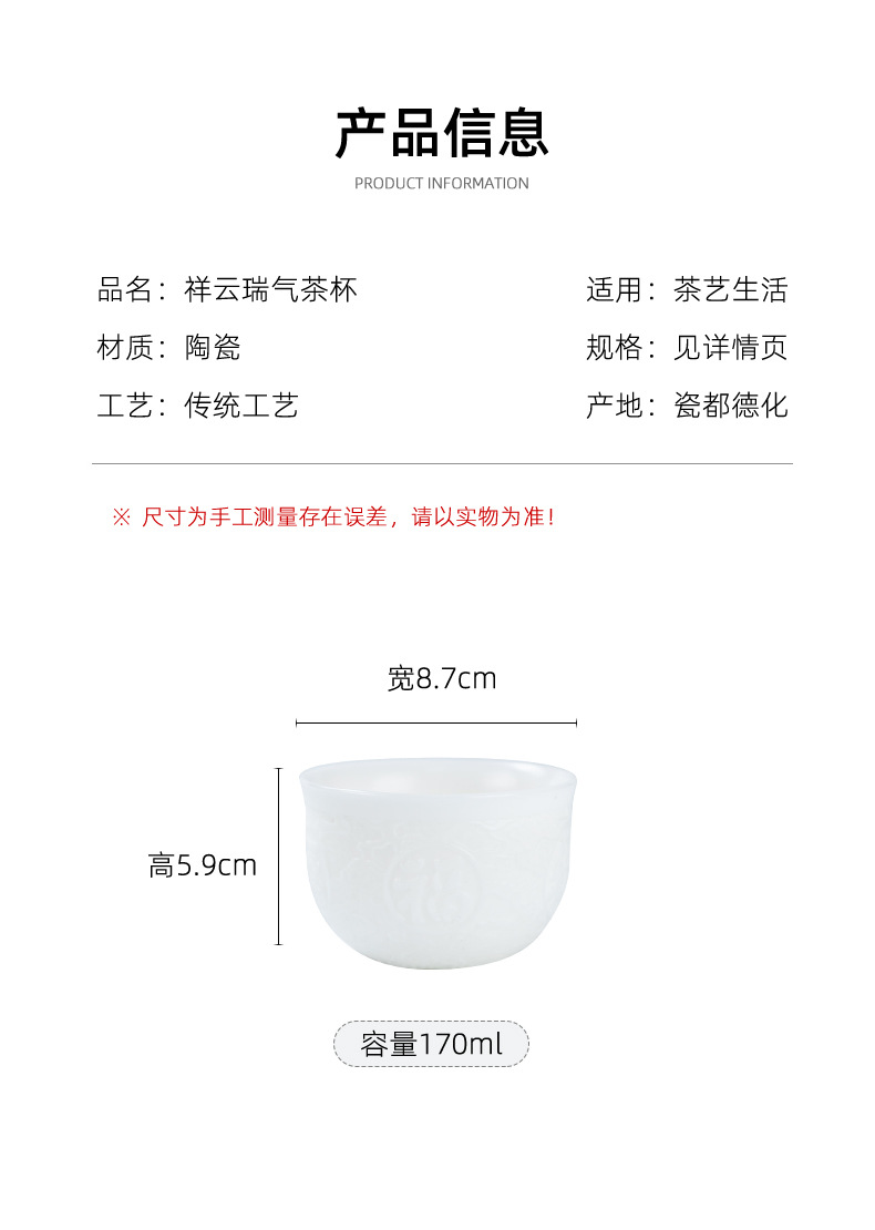徳化羊脂玉工夫ティーカップ純白品茗杯陶磁器主人杯シングルカップ家庭用茶器茶碗小カップ