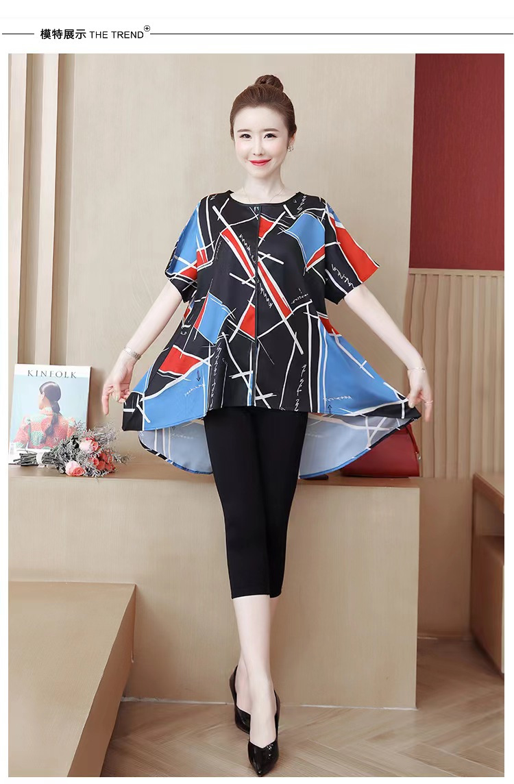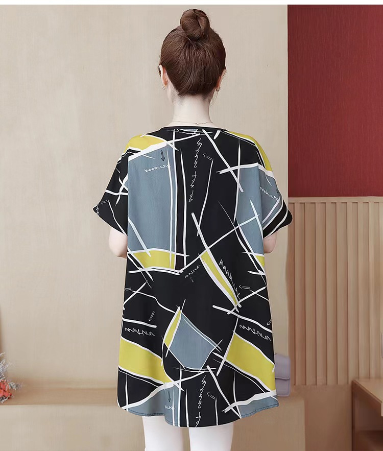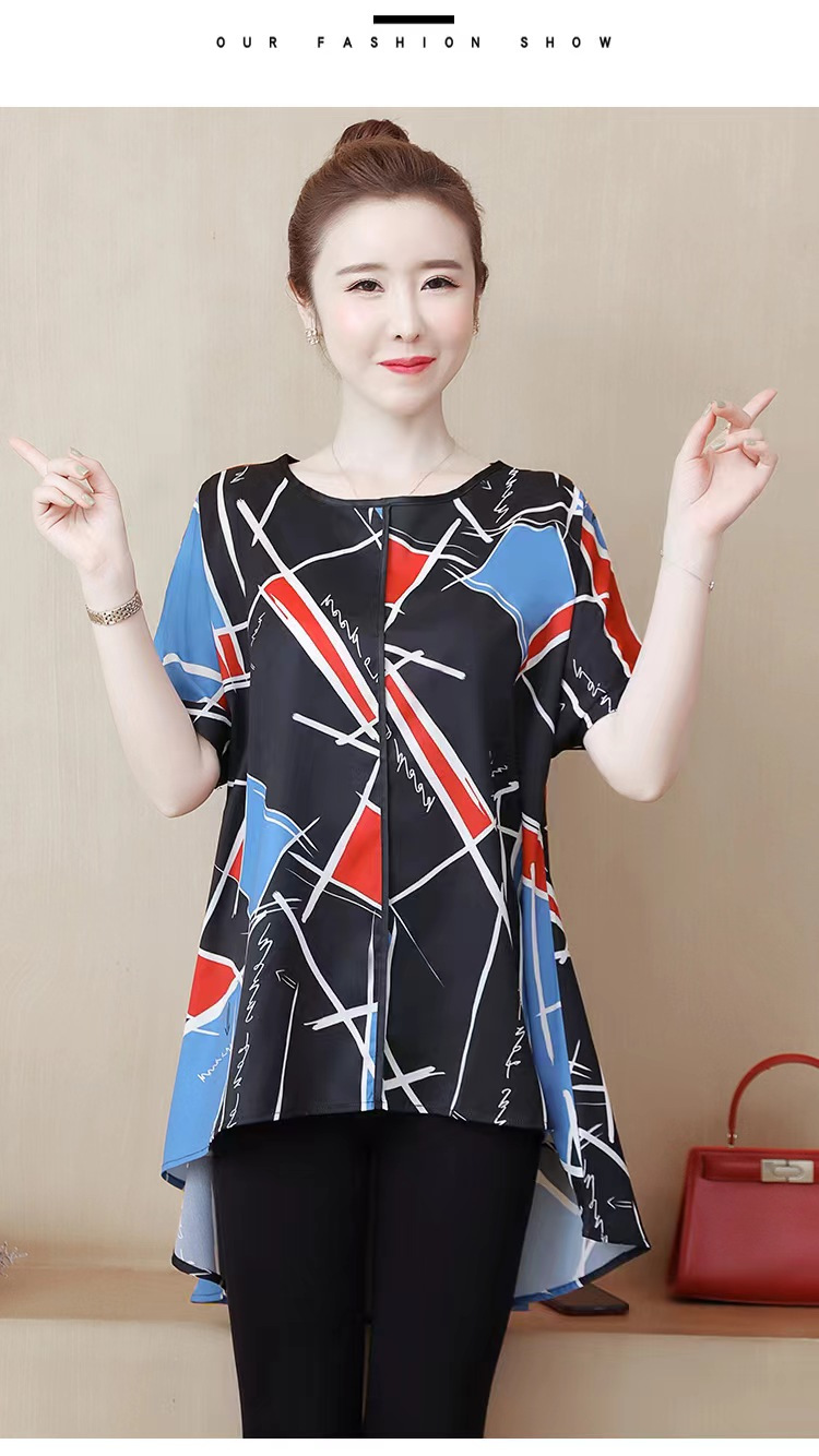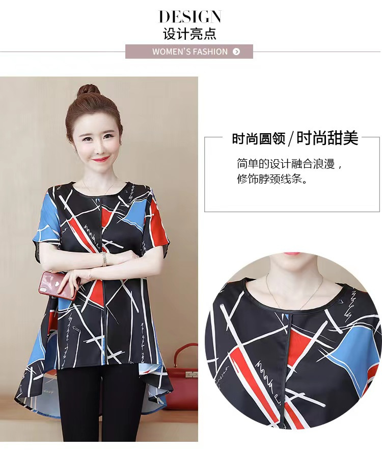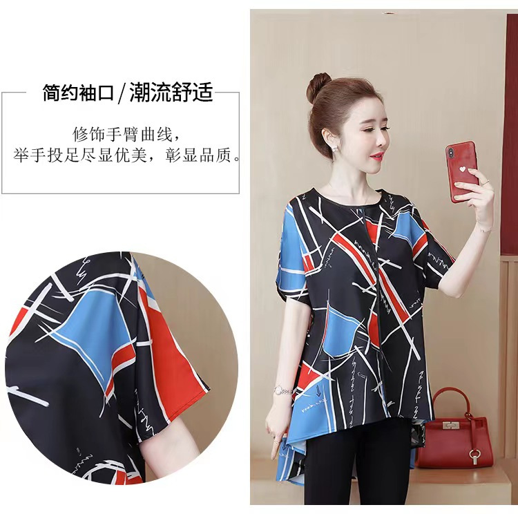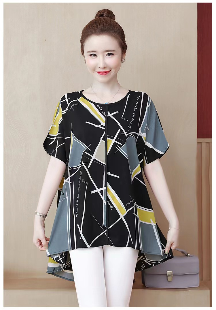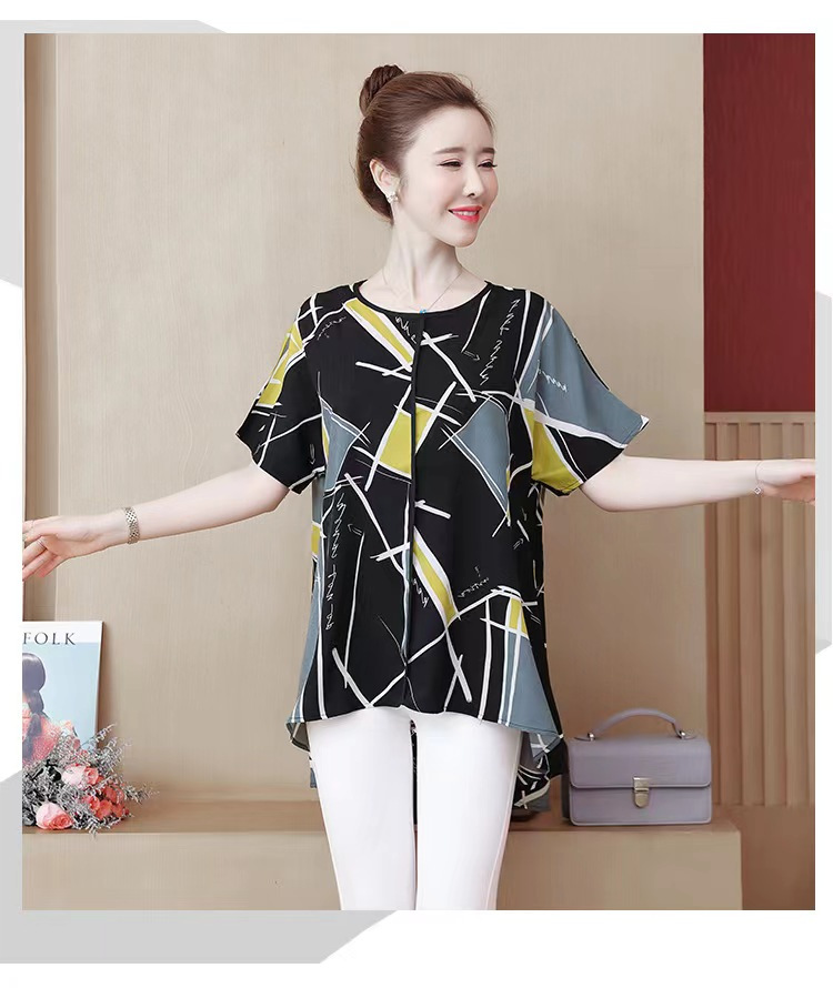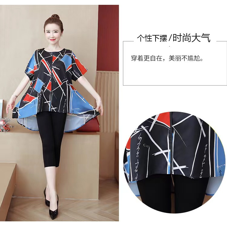 国境を越えた対外貿易の新型の大きいサイズの婦人服の2024夏の薄いタイプのプリントの半袖は腹を遮って年齢のお母さんのtシャツの上着を減らします。