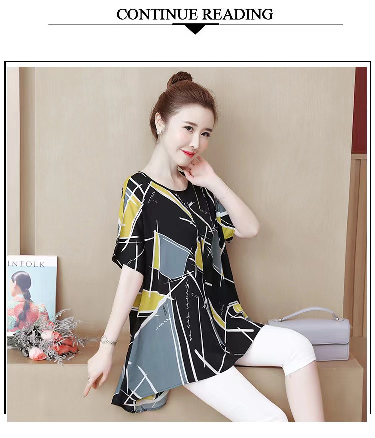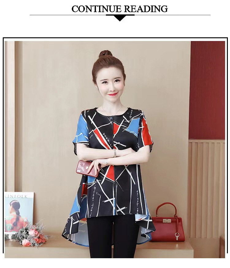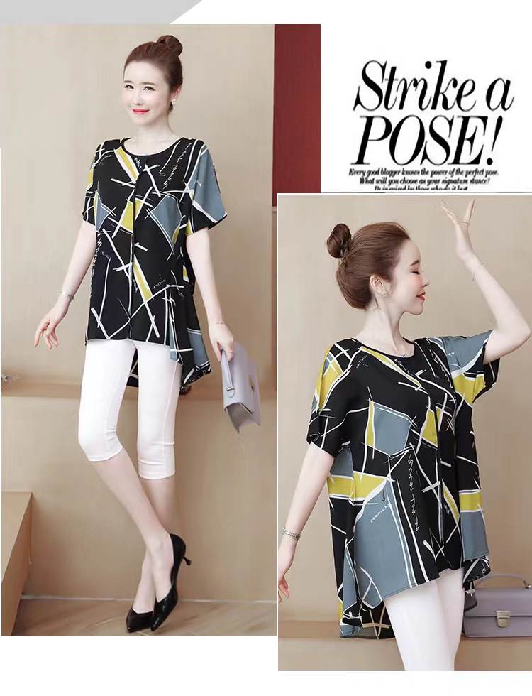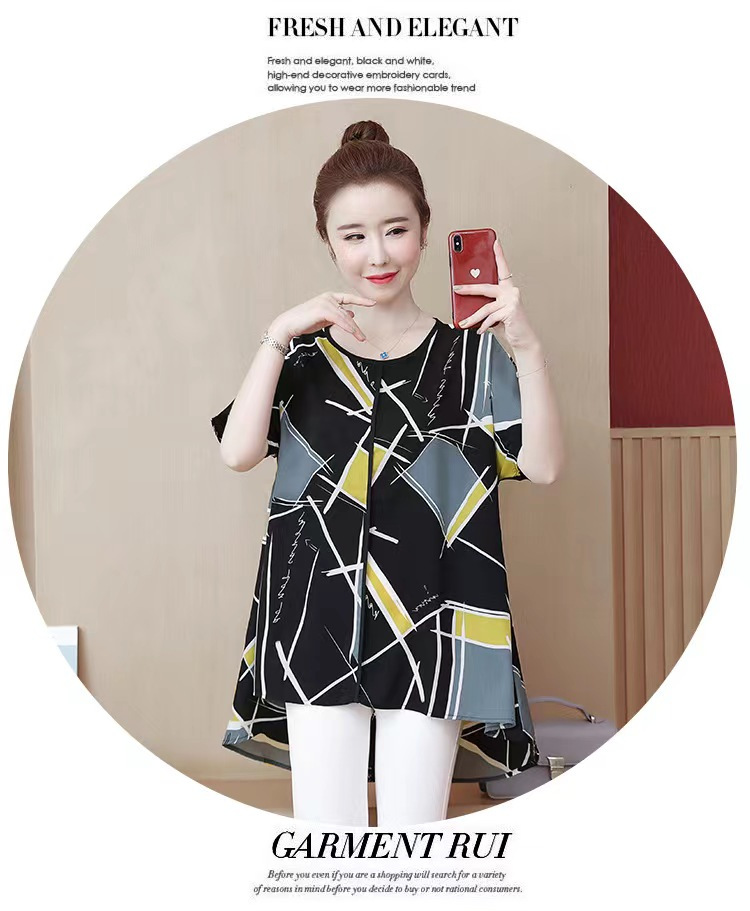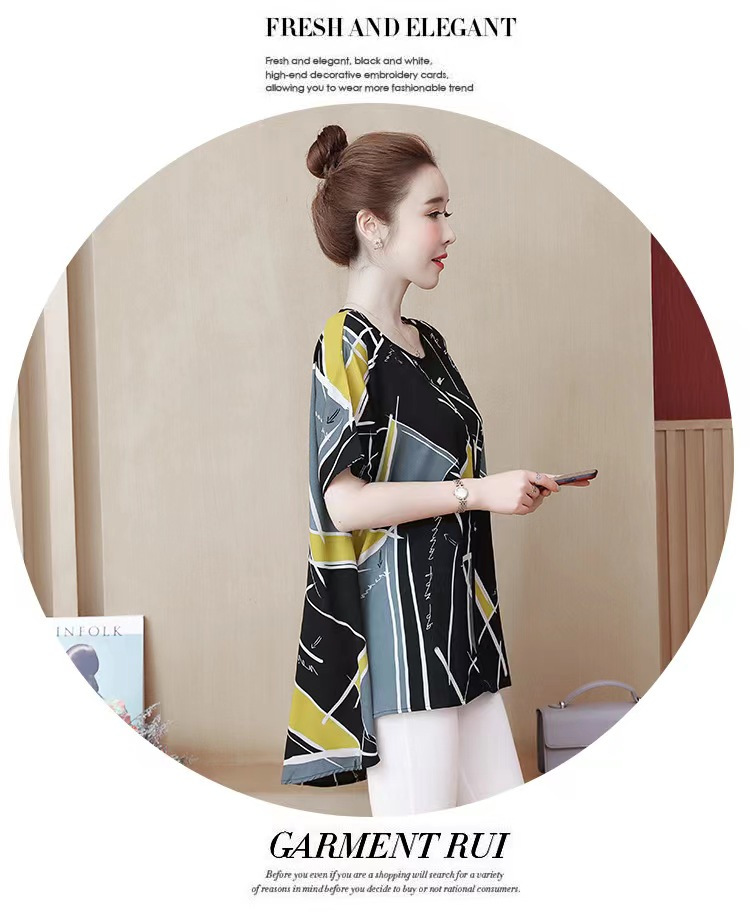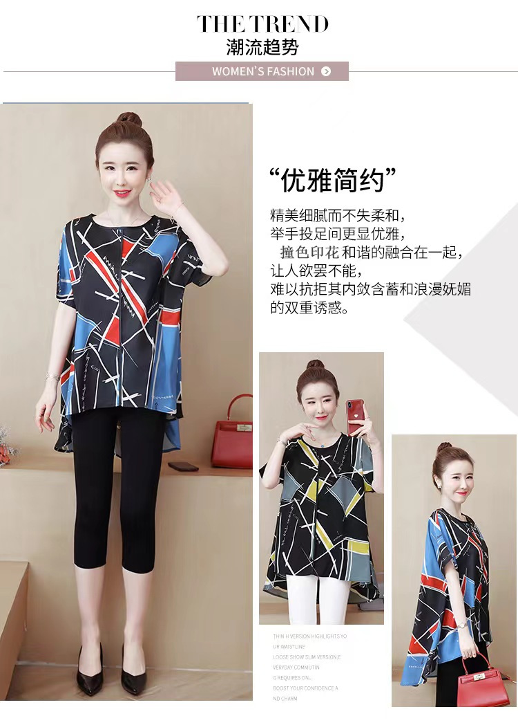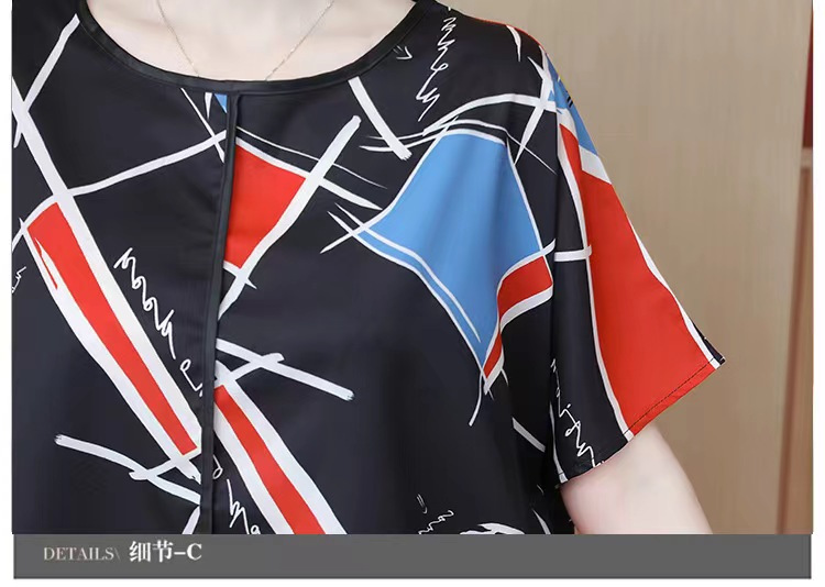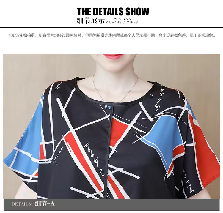 国境を越えた対外貿易の新型の大きいサイズの婦人服の2024夏の薄いタイプのプリントの半袖は腹を遮って年齢のお母さんのtシャツの上着を減らします。