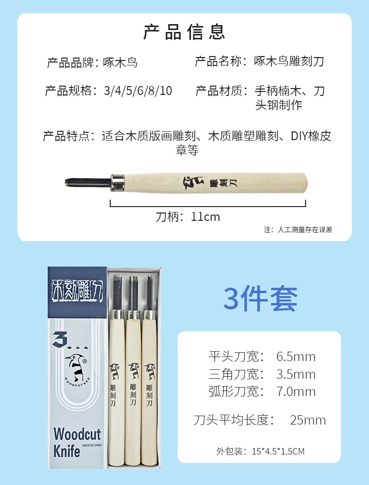 啄木鸟木刻刀学生美术专用版画工具套装手工雕刻三件套木雕篆刻刀