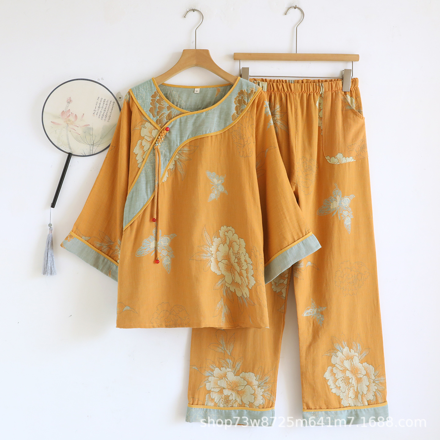 新中国式国風純綿ガーゼジャカードパジャマ女性春秋夏薄金九分袖盤は家の服を着ることができる