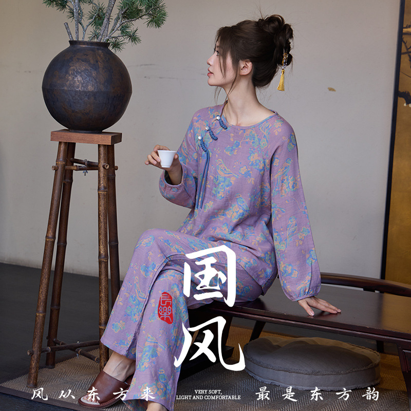 国風パジャマ新中国式純綿二重糸薄手女性春秋長袖オーダーメイドホーム服セット卸売り