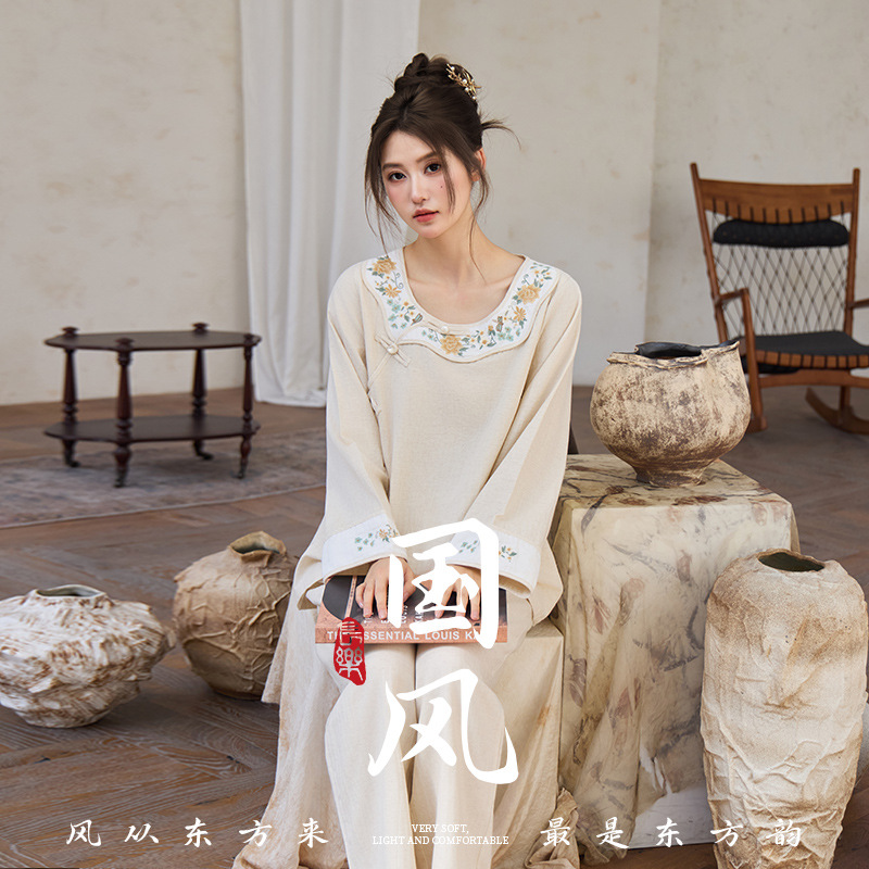 新しい中国風の刺繍入り純綿とリネンの女性用パジャマ、春、秋、夏用の薄手の長袖、屋外で着用できるホームウェアセット