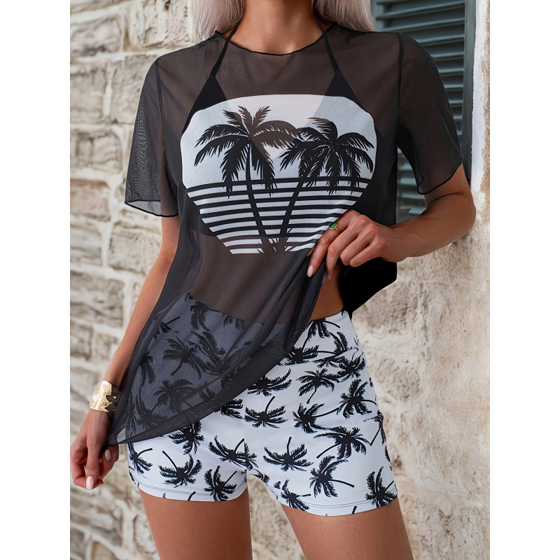 26外贸高腰平角裤网纱罩衫三件套椰树印花显瘦女士泳衣跨运动款