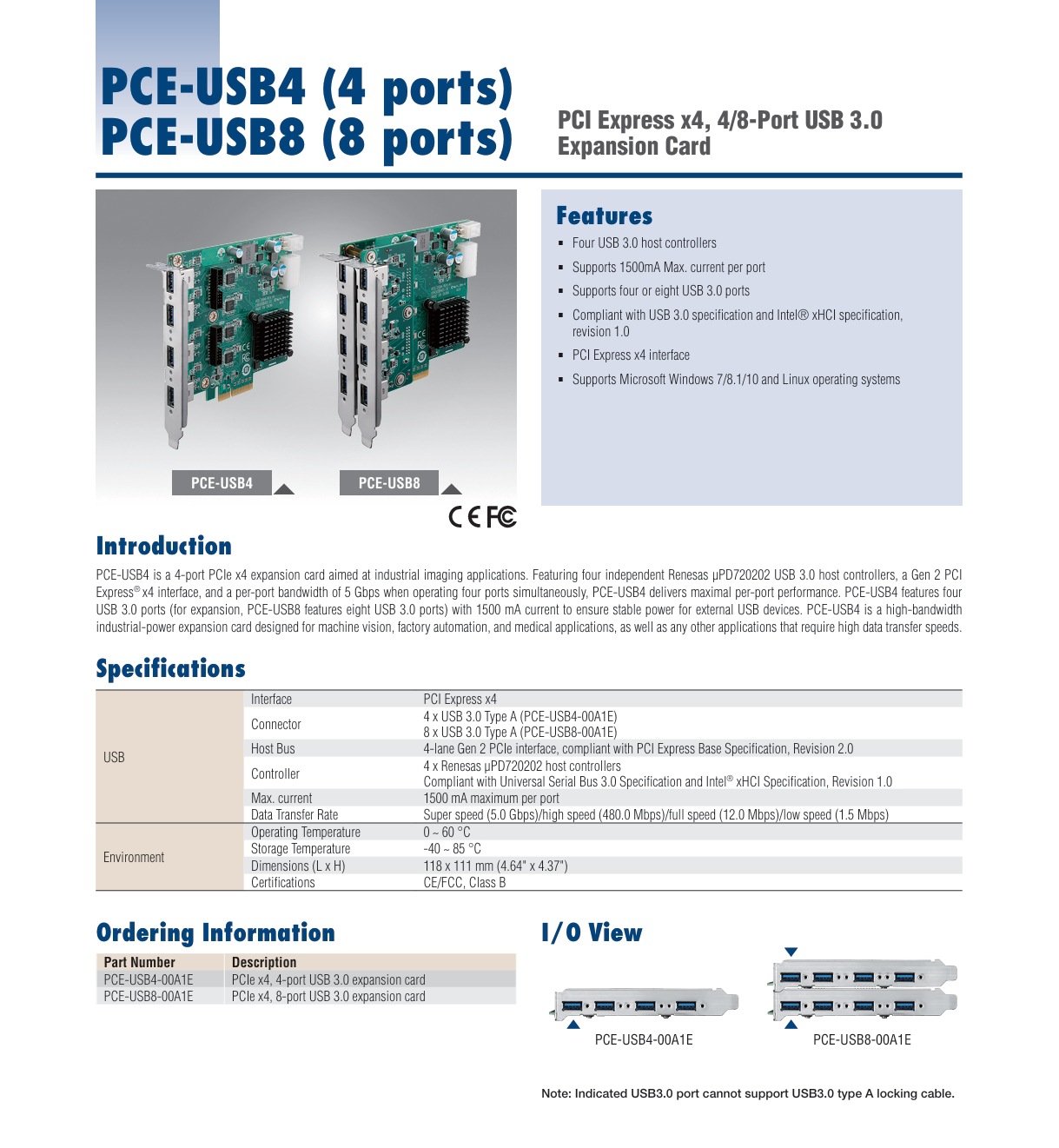 研華PCI Express x4、4/8ポートusb3.0拡張カードPCE-USB4-00A1E