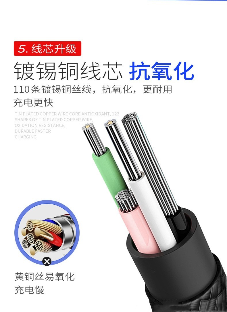 4.线材是四芯线,充电线芯和数据传输线芯各两条,充电 55*0.08*2C共110支纯铜线芯,单条铜芯采用大电流标准,直径0.08MM(镀锡铜),真正的快充数据线。单条长度1.25M。单重约30克左右。