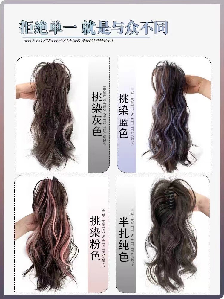 カラー 滝の半分のポニーテールの薄いブラウン,滝の半分のポニーテールの深いブラウン,滝半ザマ尾ブラウン黒,滝ハーフザッピング自然黒,滝の半分は馬尾を刺して粉を染めます。,滝の半分は馬尾を刺して青を染めます。,滝の半分は馬尾を刺して白を染めます。