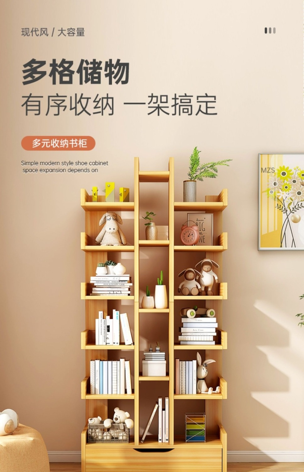 树形书架置物架落地多层客厅储物架简易窄小书柜一体靠墙边收纳架