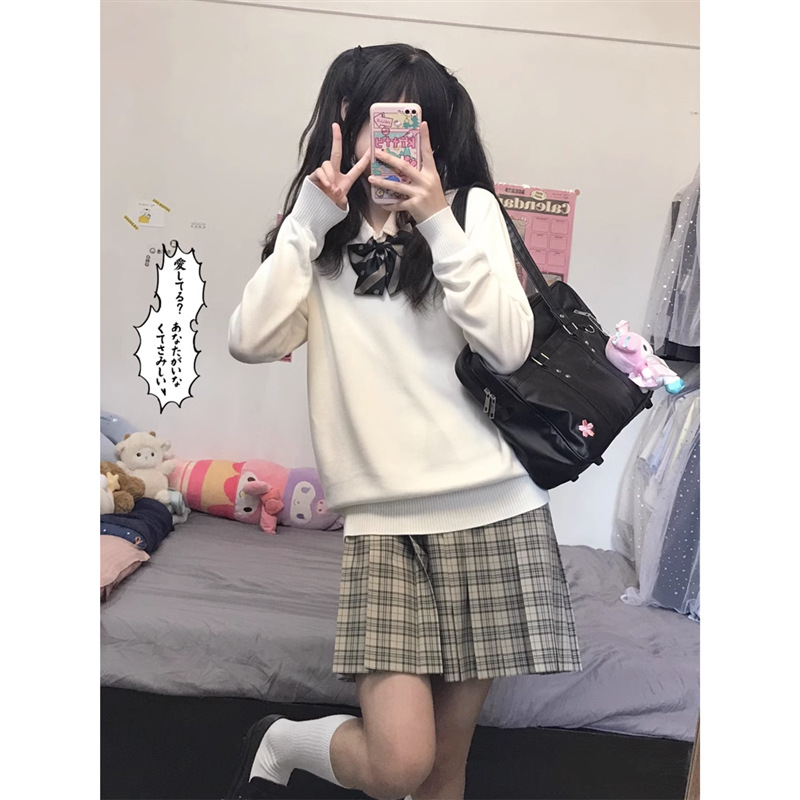 秋の長袖vネックセーター女性高級純色学院風日系jk制服秋冬プルオーバーニットセット