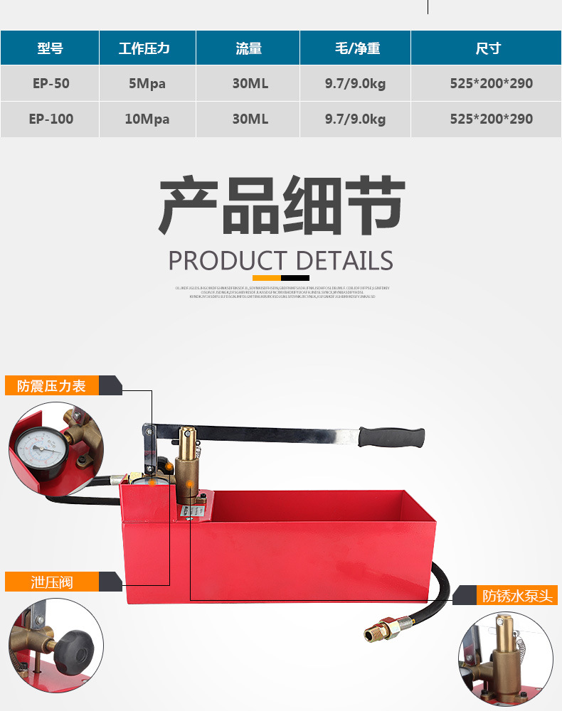 手動試圧ポンプEP-50/100キロ増圧ポンプ銅頭鉄箱耐久性地温管路試圧漏れ計