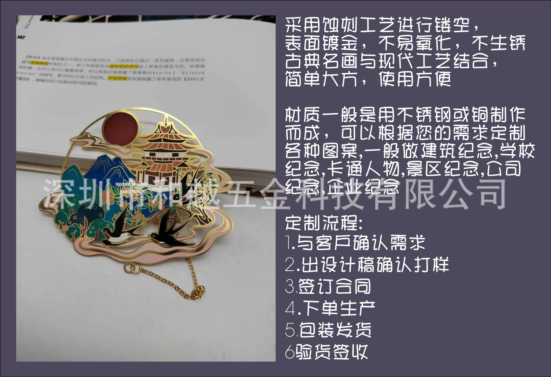 书签的厚度一般做到0.5mm,这款书签采用蚀刻工艺进行镂空,表面电镀金色,不易氧化,不生锈,古典名画与现代工艺结合,简单大方,使用方便,材质一般是用不锈钢或铜制作,可以根据您的需求定制,各种图案,一般做建筑纪念,学校纪念,卡通人物,景区纪念,公司纪念,企业纪念
