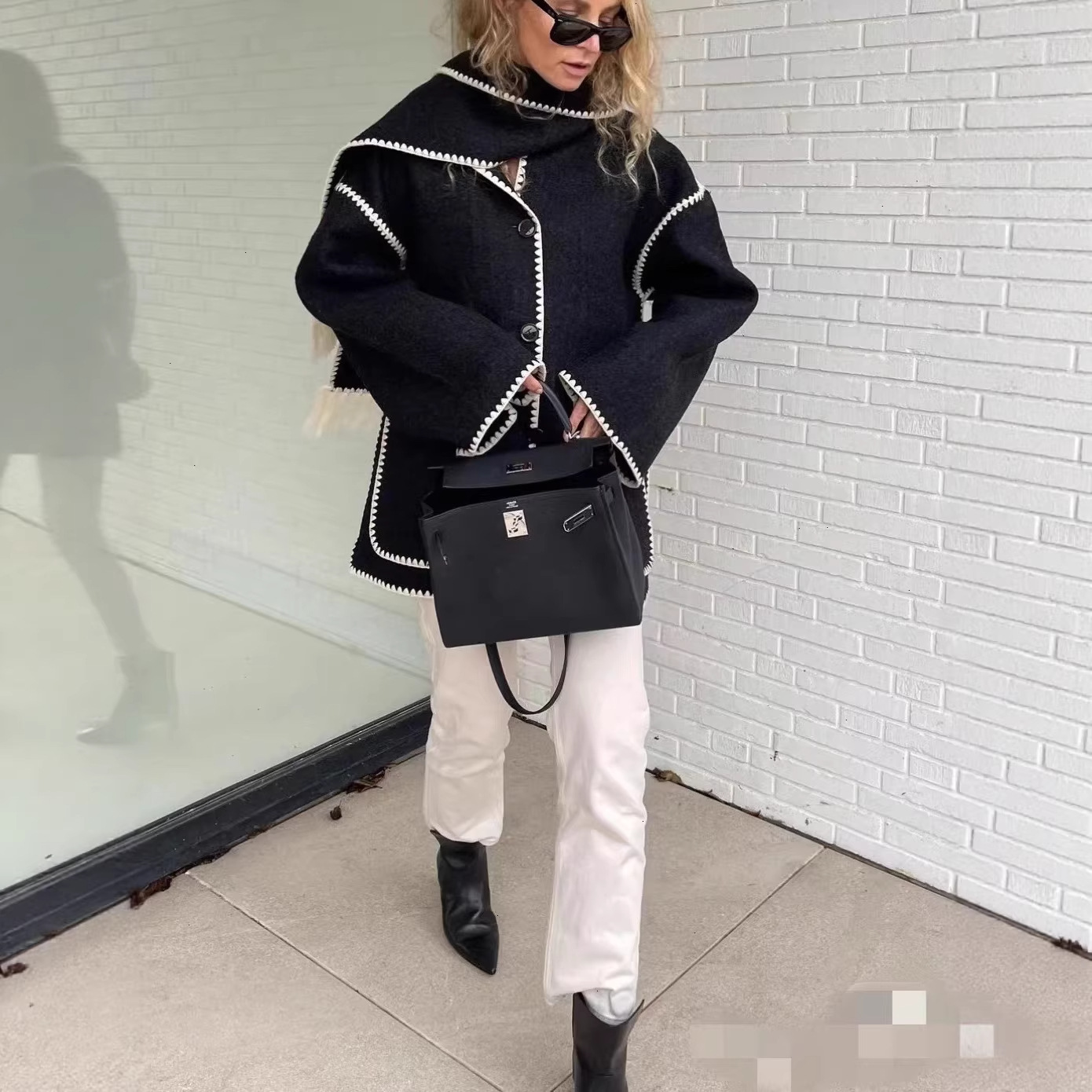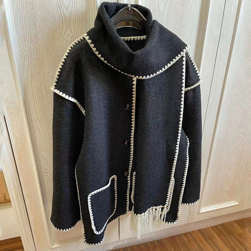 素美汇 2025秋冬新款北欧TOT宽松外套围巾一体短款羊毛大衣女