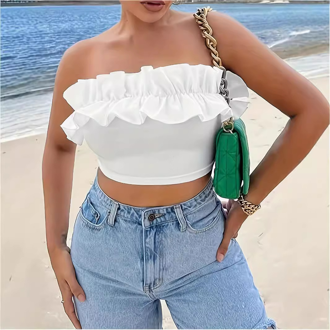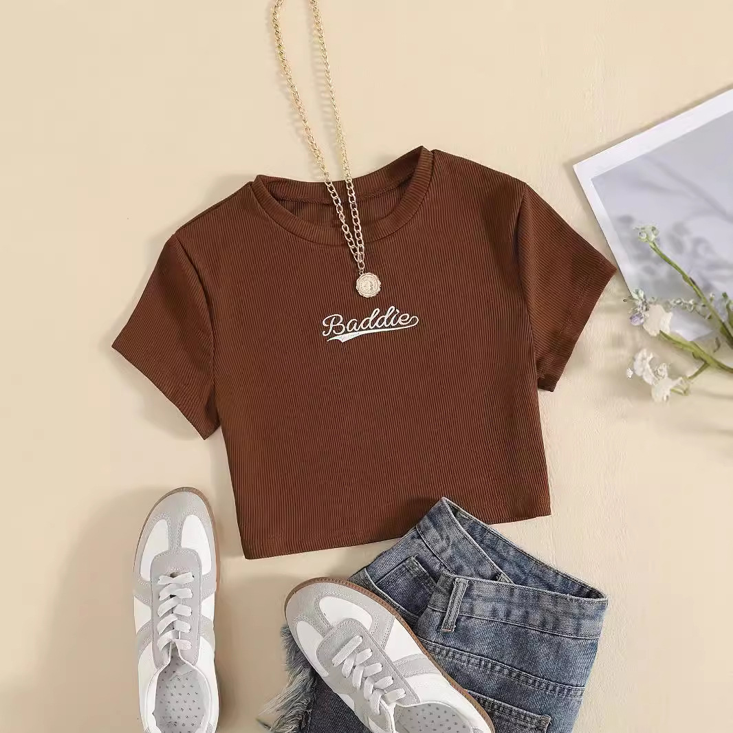 2025年アマゾン新作刺繍Tシャツ ショート丈無地露出へそスリムフィット刺繍Tシャツ