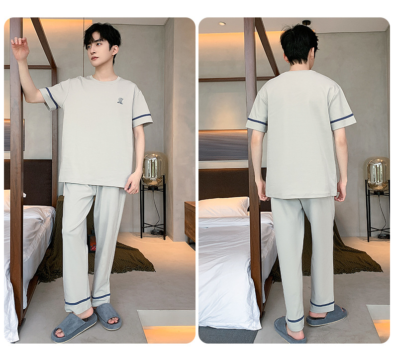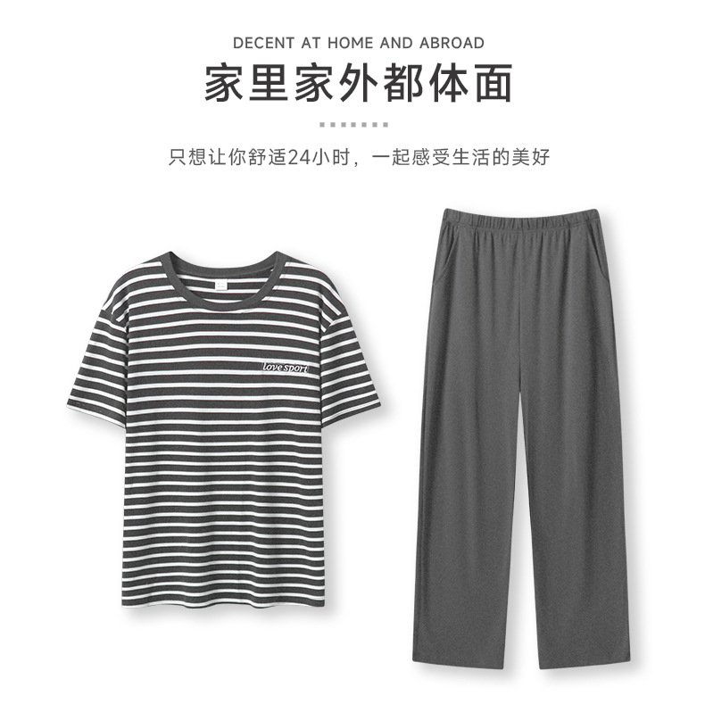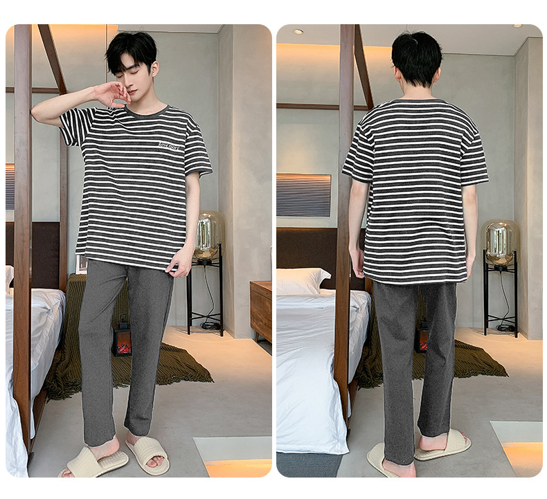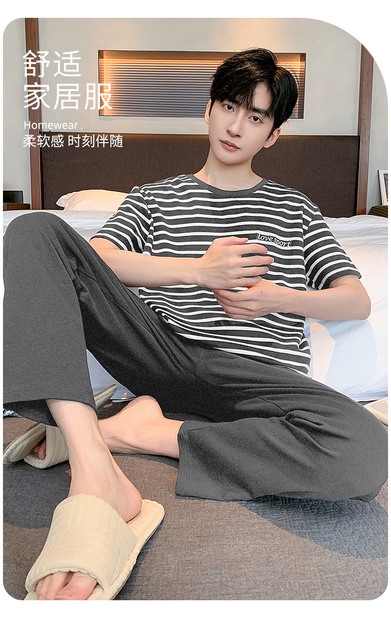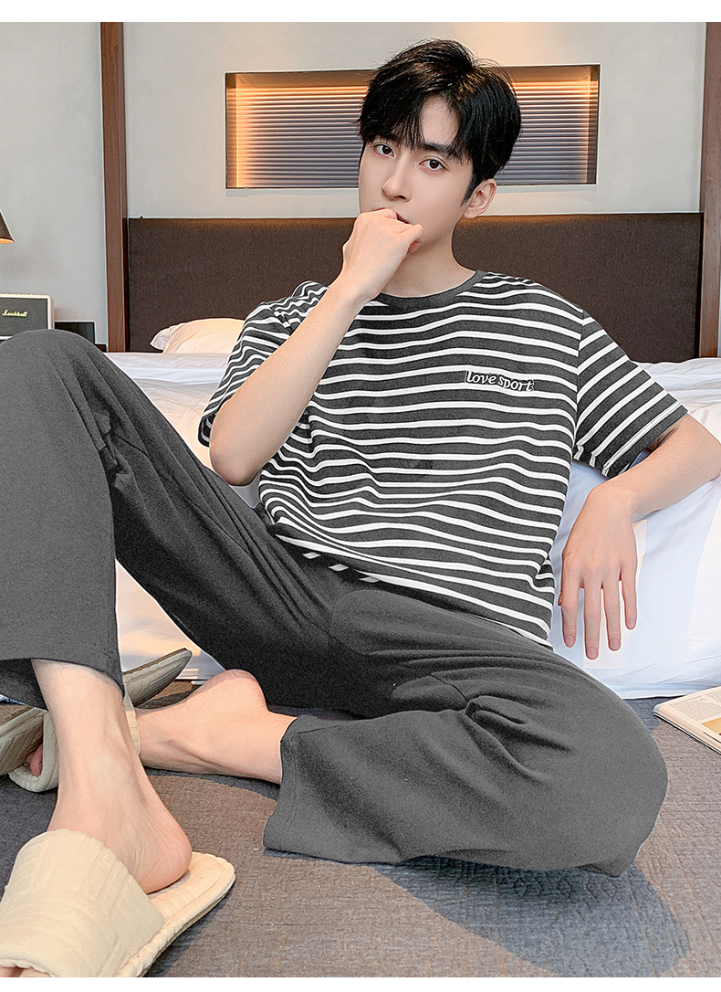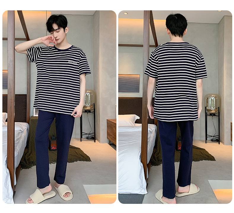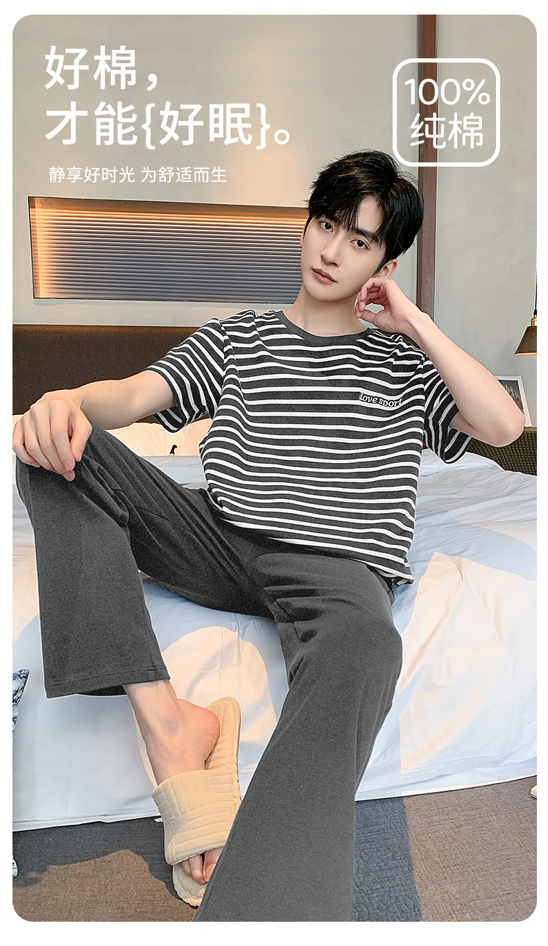 純綿半袖パジャマ男性夏のカジュアルストライプの大きいサイズの軽い運動は綿のズボンの男性の部屋の服を着ることができます。