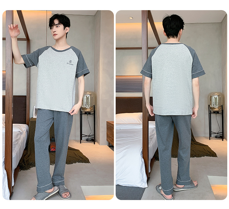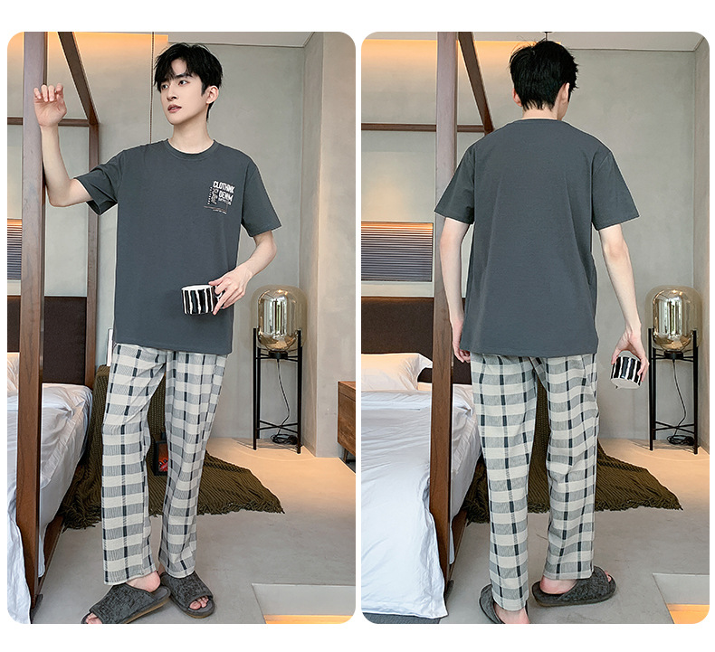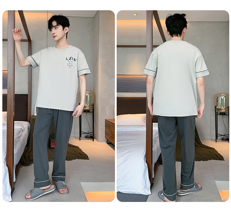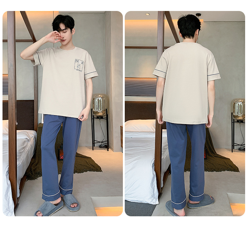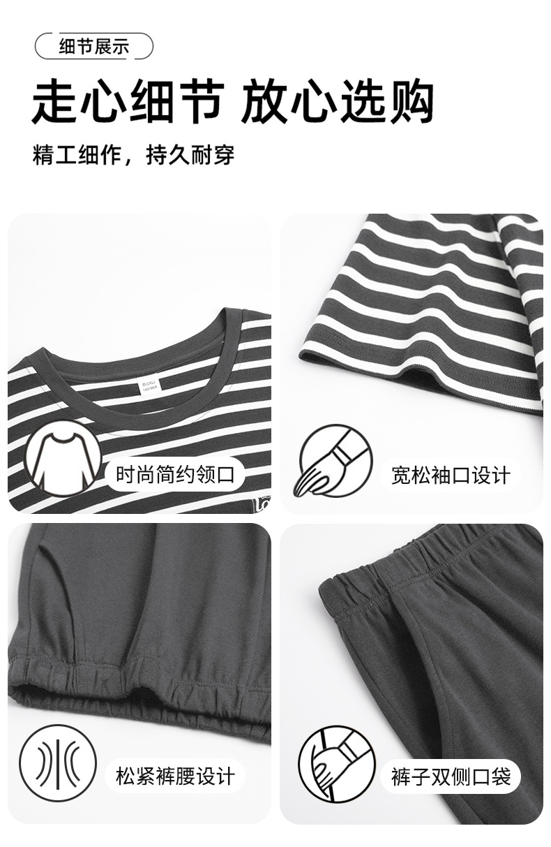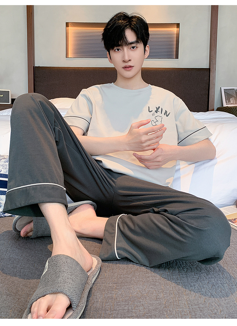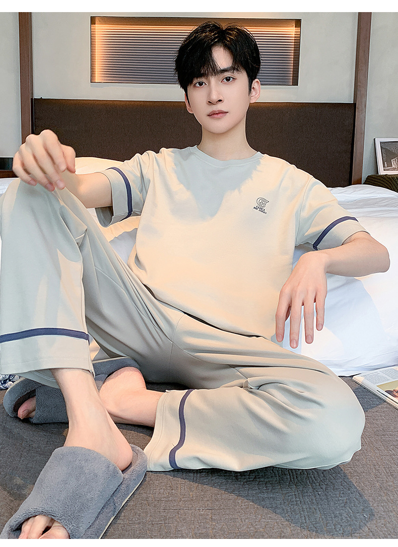 純綿半袖パジャマ男性夏のカジュアルストライプの大きいサイズの軽い運動は綿のズボンの男性の部屋の服を着ることができます。