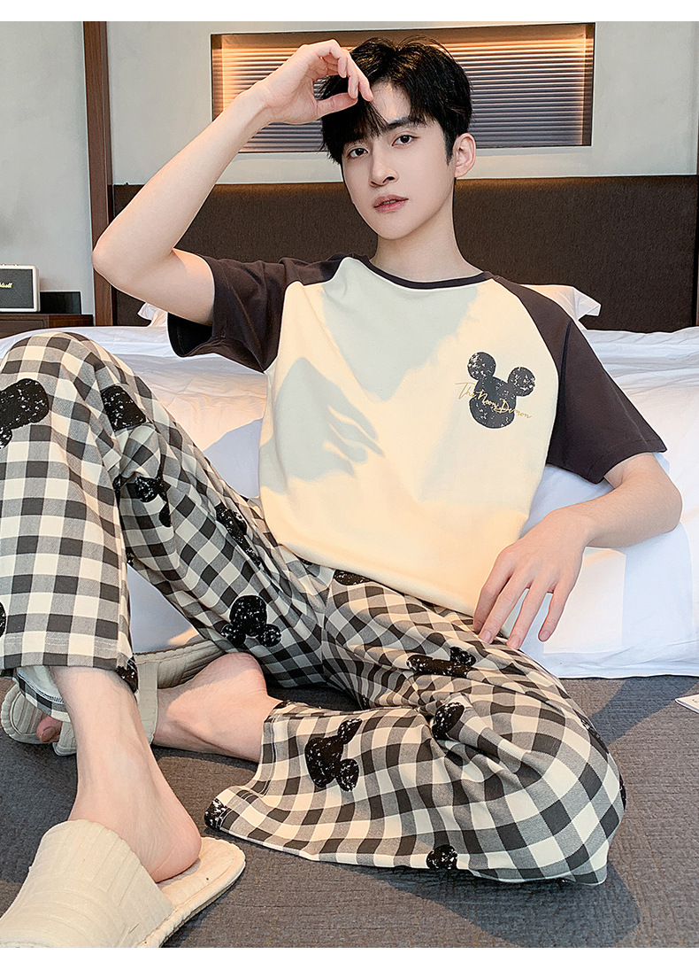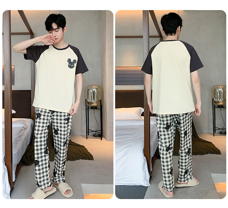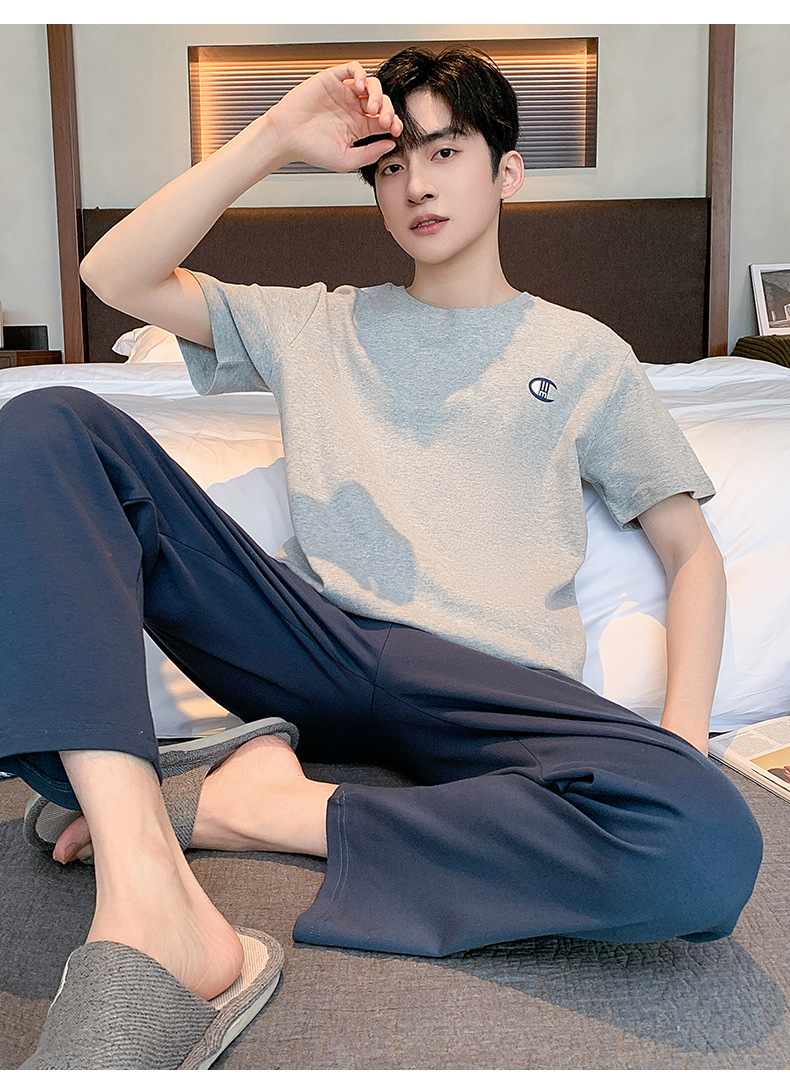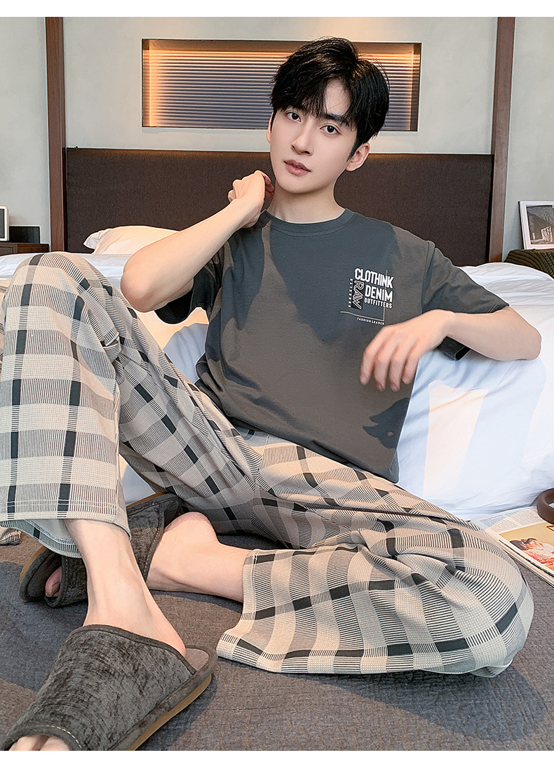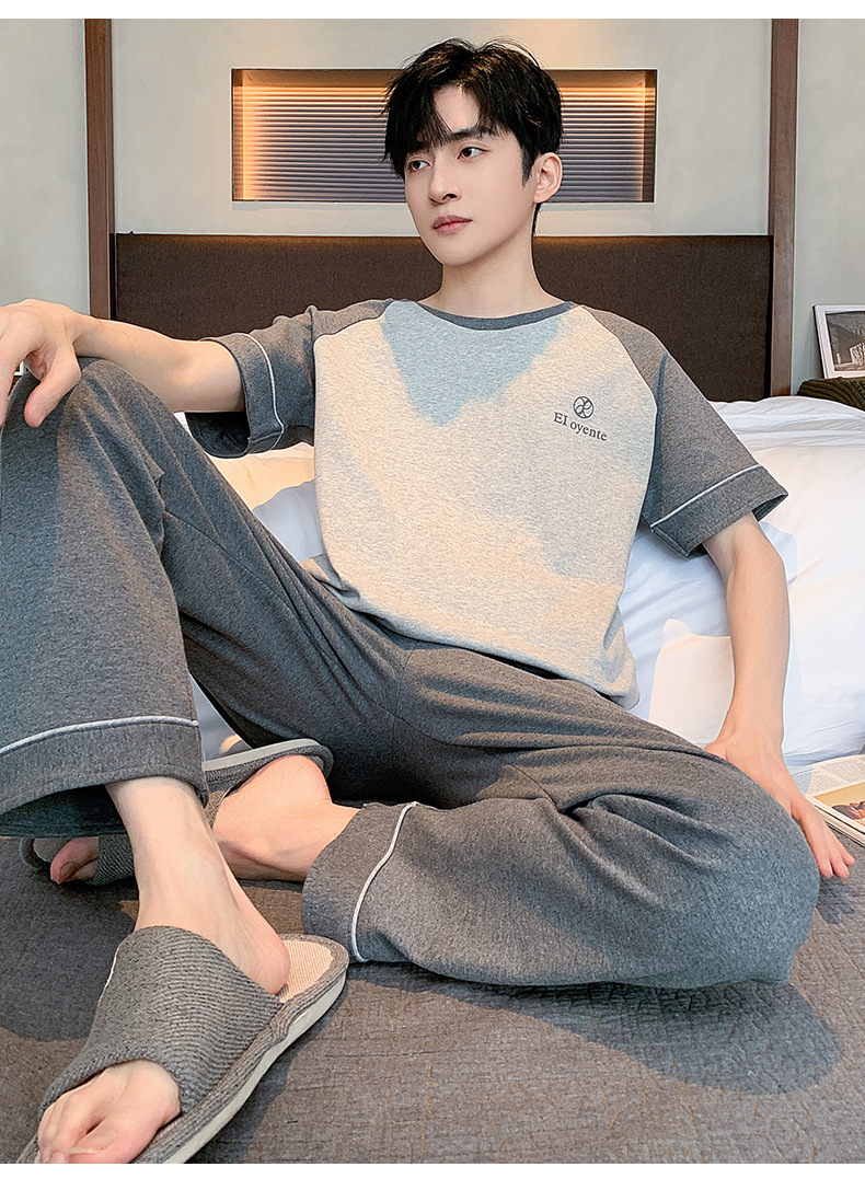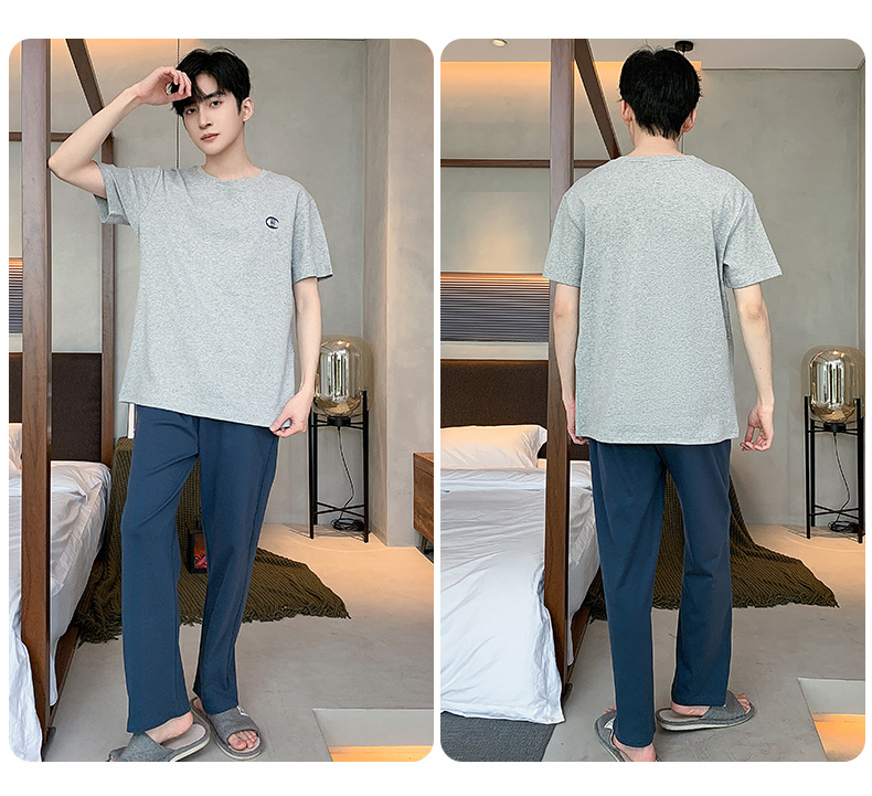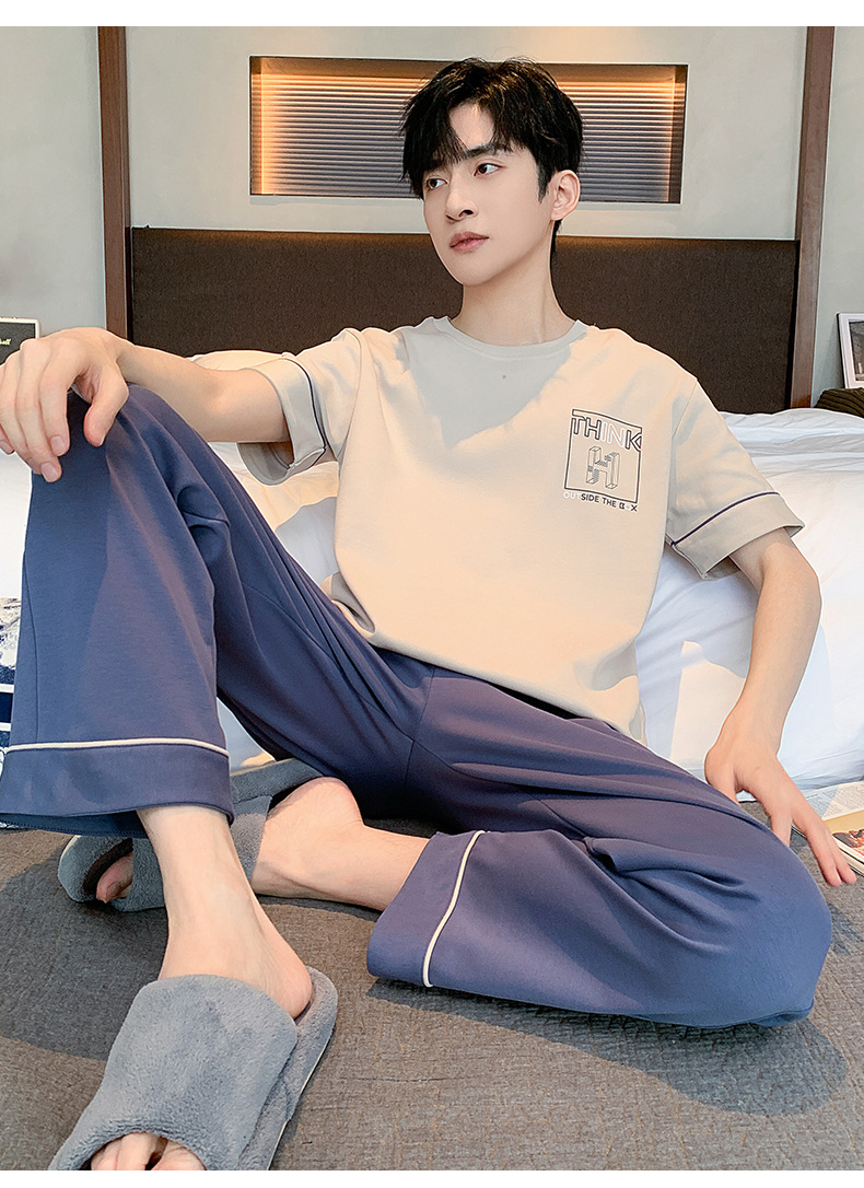 純綿半袖パジャマ男性夏のカジュアルストライプの大きいサイズの軽い運動は綿のズボンの男性の部屋の服を着ることができます。