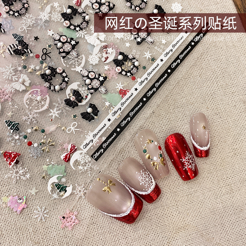 跨境新款圣诞节美甲贴纸5D浮雕立体圣诞树雪花圣诞老人爆款指甲贴