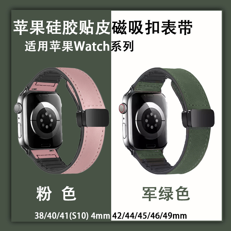 适用苹果系列 apple watch 6/7/8/9/S10 硅胶贴皮折叠磁吸扣表带