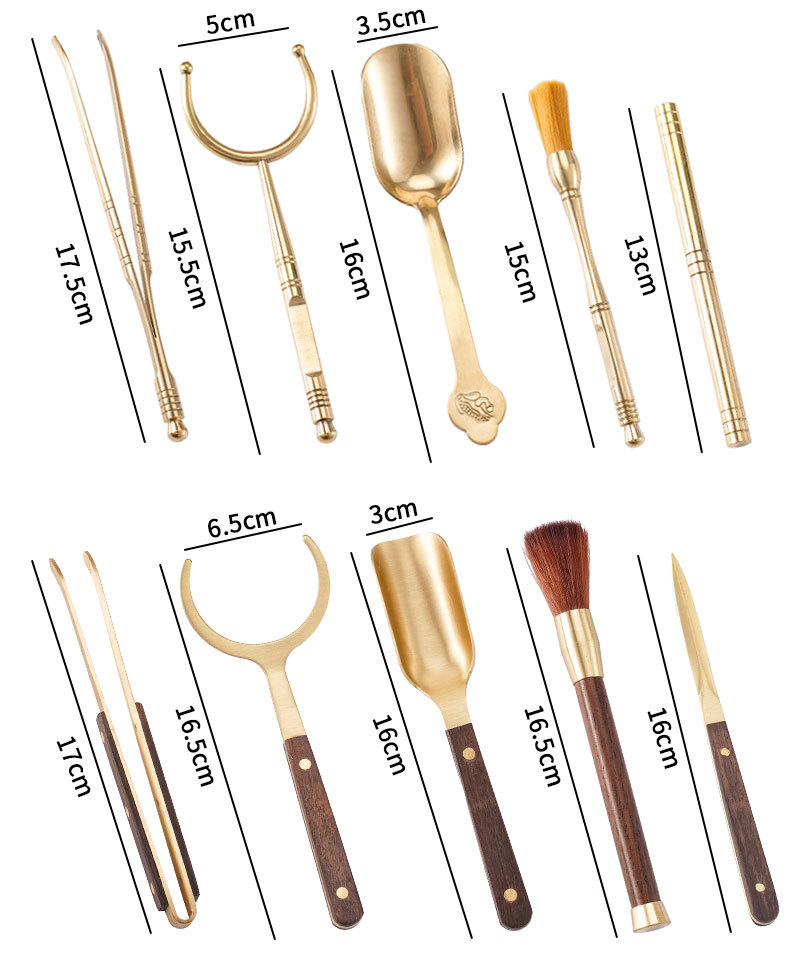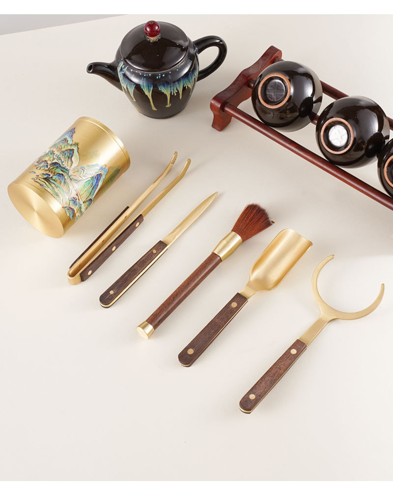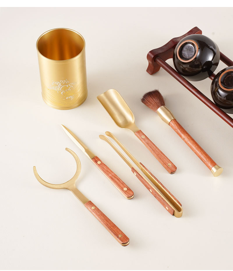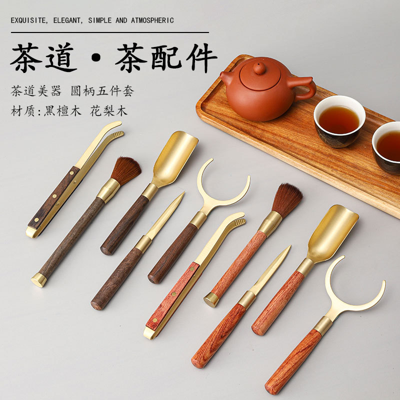 真鍮茶器セット銅木茶挟み茶葉さじ養壺筆アクセサリー真鍮花梨黒檀木茶道六君子