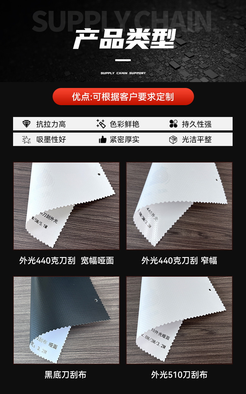 440Gナイフカット布、510Gバナーファブリック、広告用布、PVC複合ライトボックス布、UV耐光ナイフカット布、高輝度UV耐光。