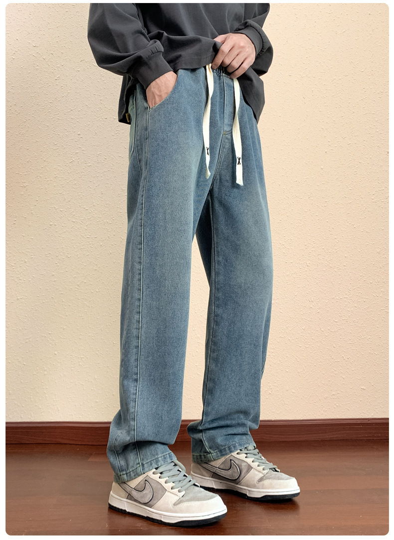 アメリカのレトロなひものジーパンの男性の春秋の新型のゆったりしている直筒の高い街のvibeのファッションのブランドの広い足のカジュアルなズボン