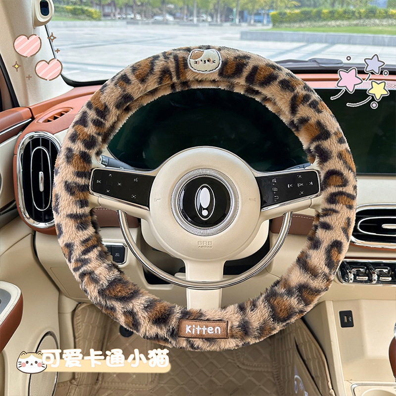卡通猫咪汽车方向盘套冬季毛绒跨境豹纹车用把套车载方向盘保护套