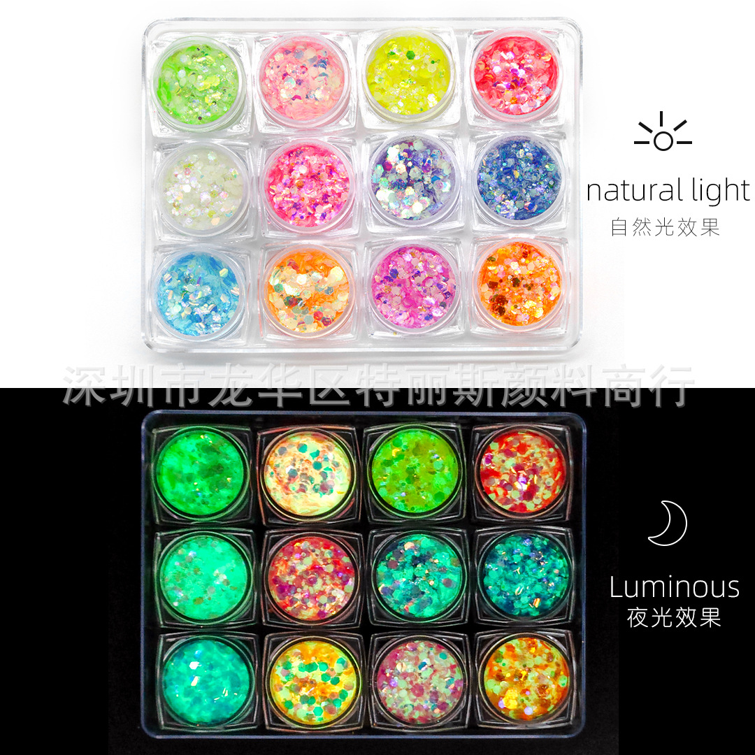 卸売り夜光スパンコール12色スパンコールキラキラファンシー混合発光粉メーカー卸売りスパンコールネイルアクセサリー