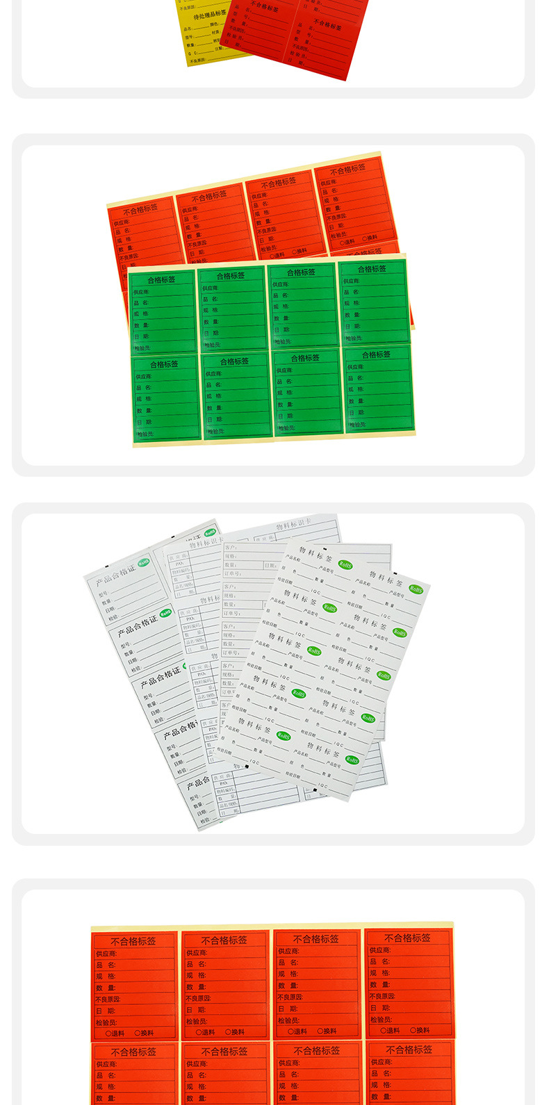 規格型番 合格証グリーン (45*50mm) 1000pcs,合格証白色(45*50mm) 1000pcs,不合格証 (45*50mm) 1000pcs,不良品ラベル (45*50mm);1000pcs,特採ラベル (45*50mm) 1000pcs,不合格ラベル (60*50mm) 1000pcs,材料マーキングカード (78*50mm);1000pcs,材料ラベル + rohs (65*40mm) 1000pcs,出荷ラベル (75*35mm);1000pcs,処理待ちラベル (60*50mm) 1000pcs,製品合格証 + rohs (65*50mm) 1000pcs,不合格ラベル (60*75mm) 1000pcs,合格ラベル (60*75mm) 1000pcs