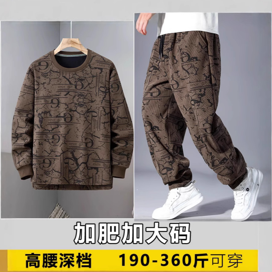 2025新款大码印花插兜卫衣套装男冬季男士加肥加大加绒休闲运动服