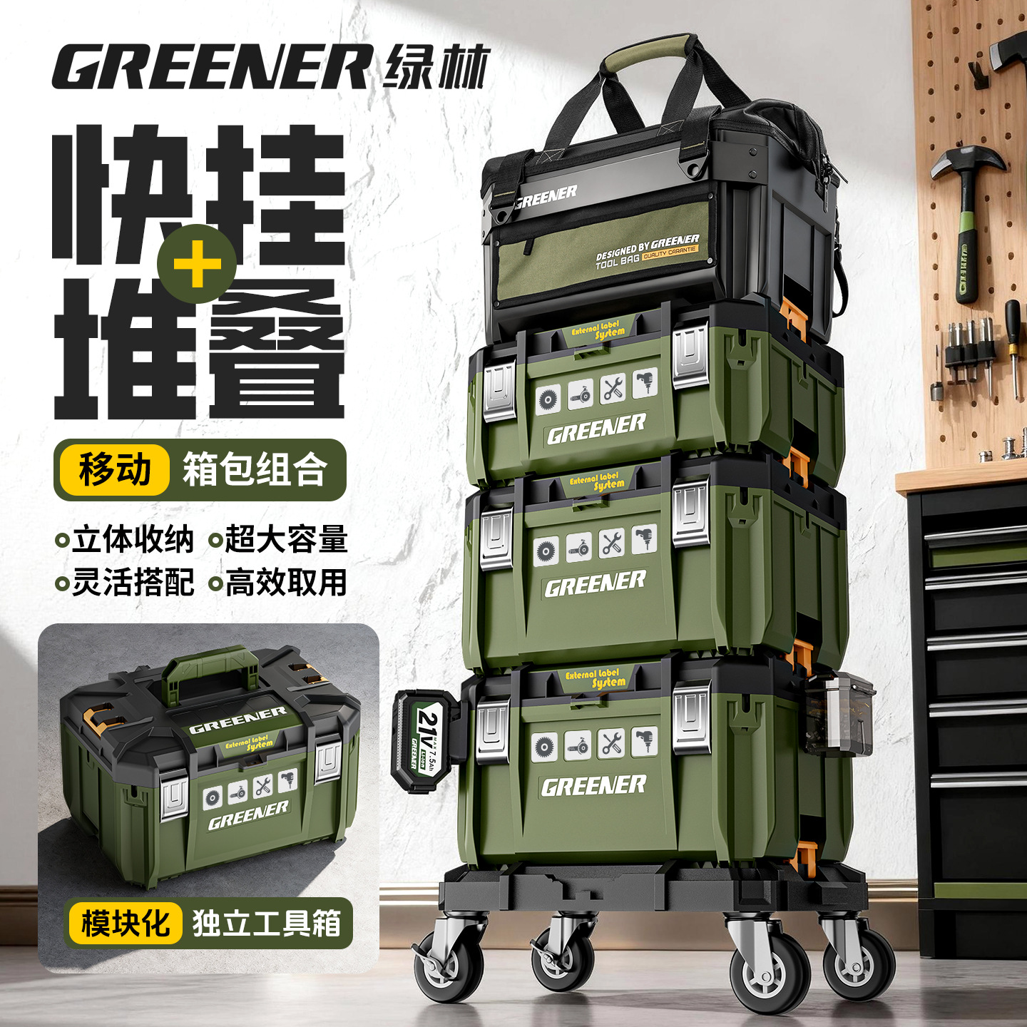 绿林堆叠工具箱套装大型五金加宽收纳箱盒多功能堆嵌大号带轮拉杆