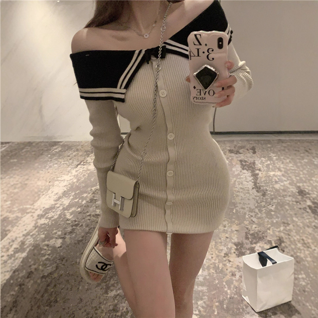 一字肩长袖连衣裙女秋季新款高级感纯欲辣妹修身包臀短裙