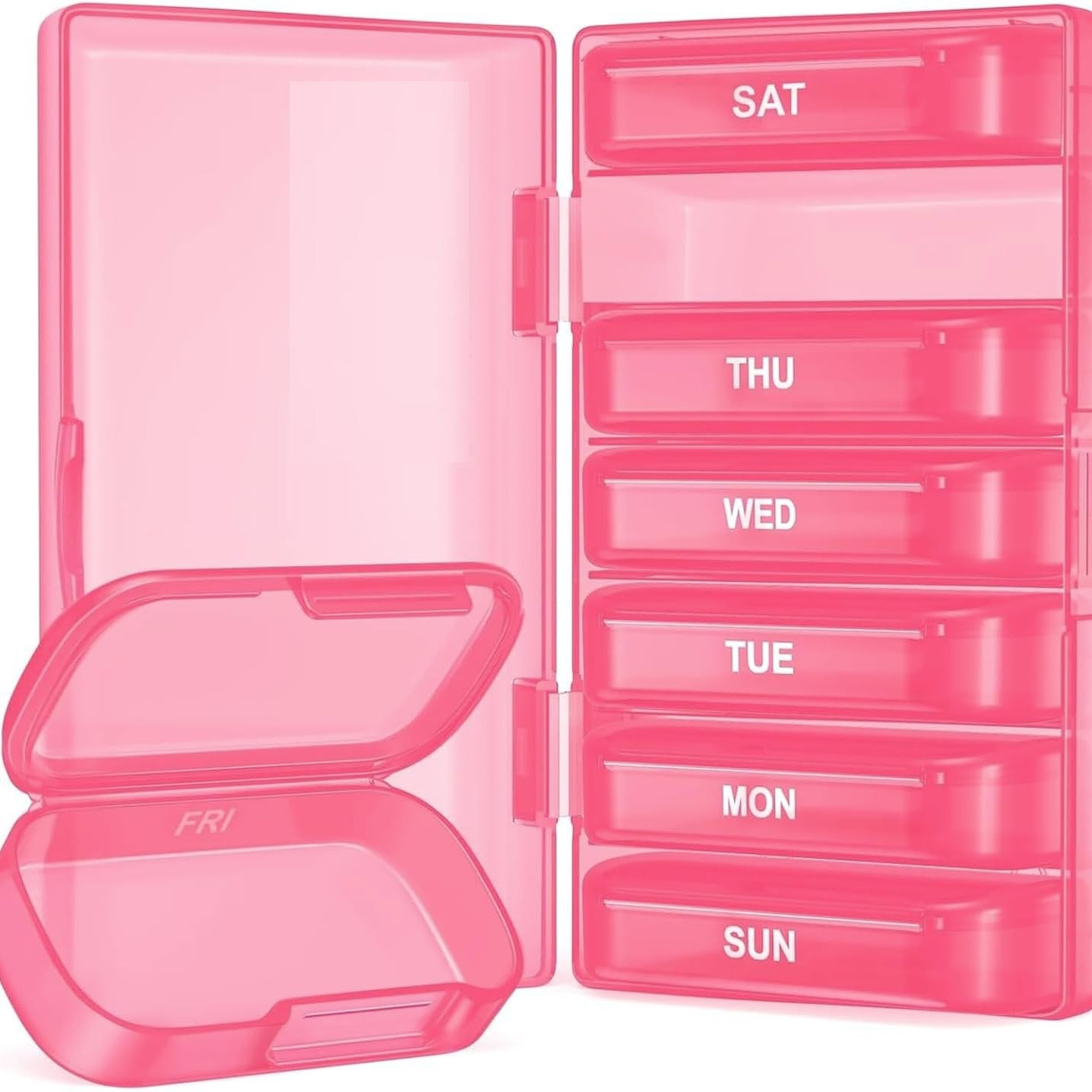 temu亚马逊桃红色一周七天每天3次14格翻盖式药盒 每周药丸收纳盒