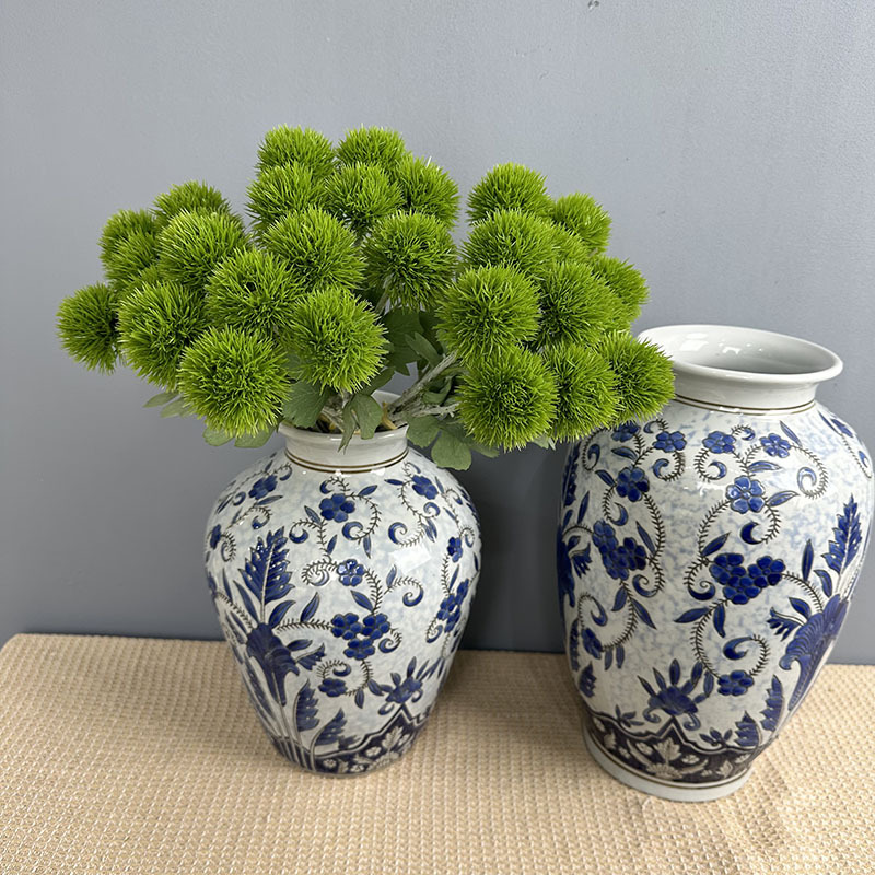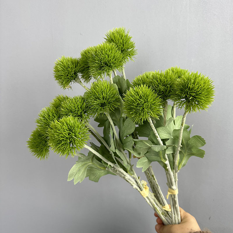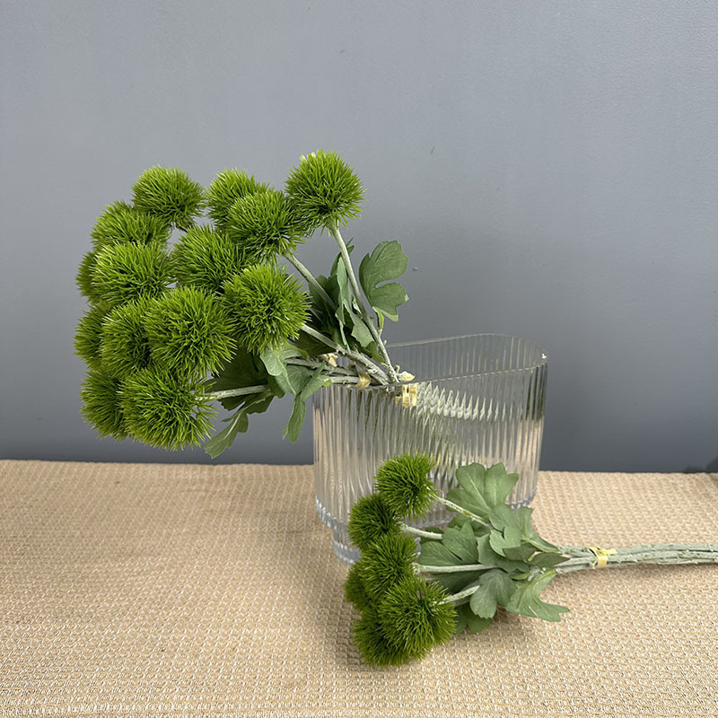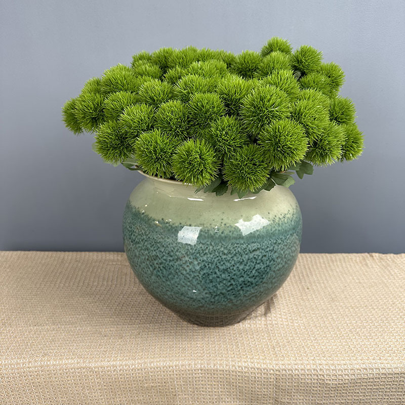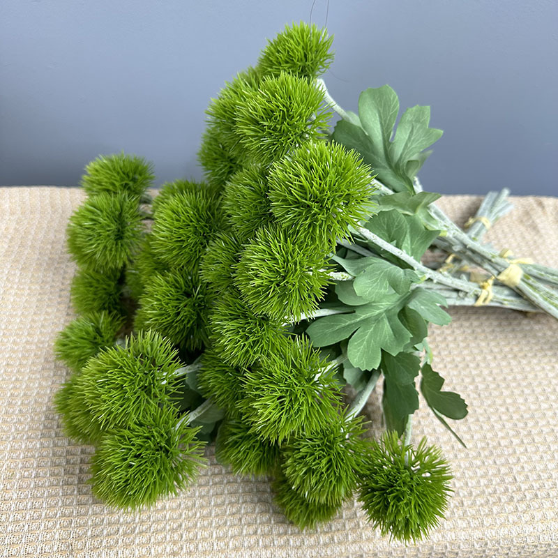 緑の石竹の家庭のデパートのサンプルの間の偽の花の生け花の陳列の手触りの柔らかいゴムの緑の毛のボールの手触りの石竹をシミュレーションします。