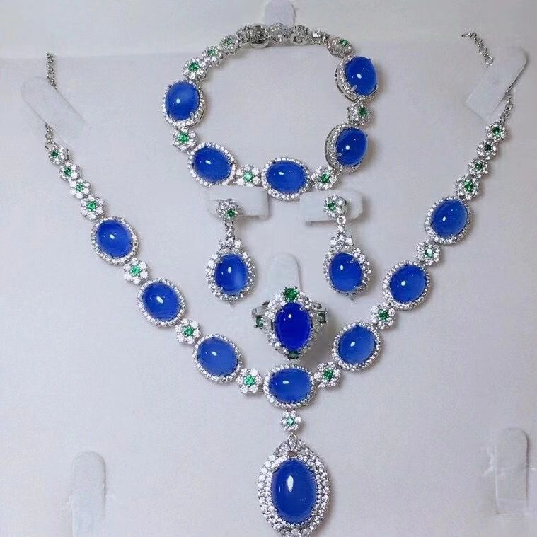 新中国式高級サファイア玉髄四点セットヴィンテージレトロ宮廷銅メッキ銀国風ジュエリーセット