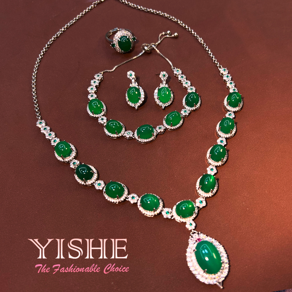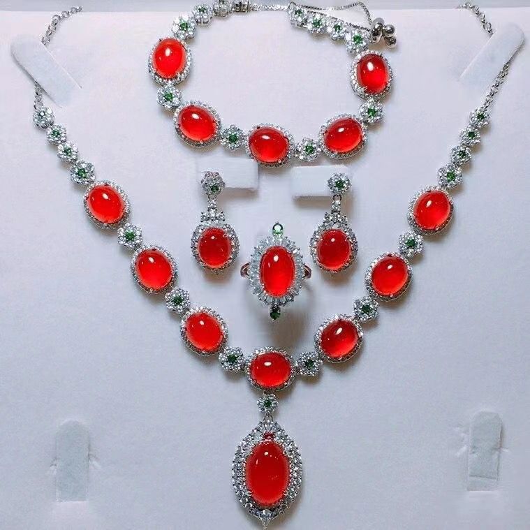 新款镀银镶嵌绿玉髓鸽子蛋套装粉玛瑙项链耳环手镯套装礼盒