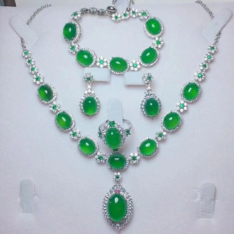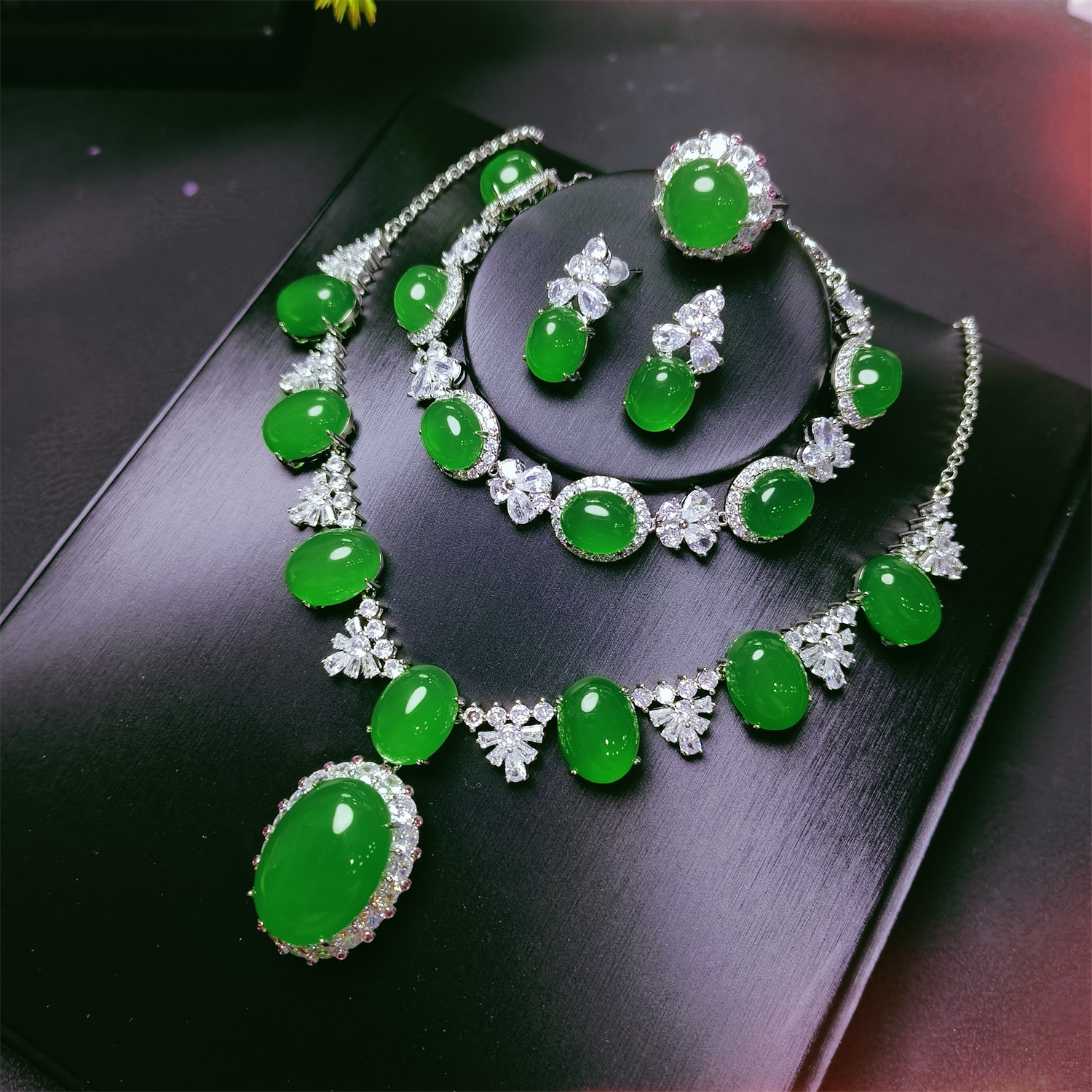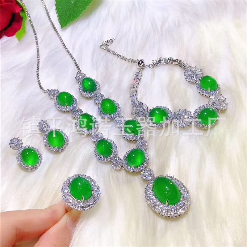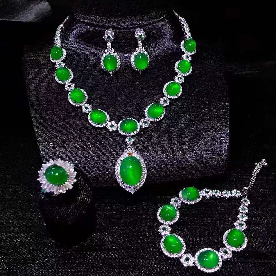 玉髄セット卸売り氷種玉髄ペンダントネックレスイヤリング指輪のブレスレットは豪華に緑玉髄の四つのセットをはめ込んでいます。