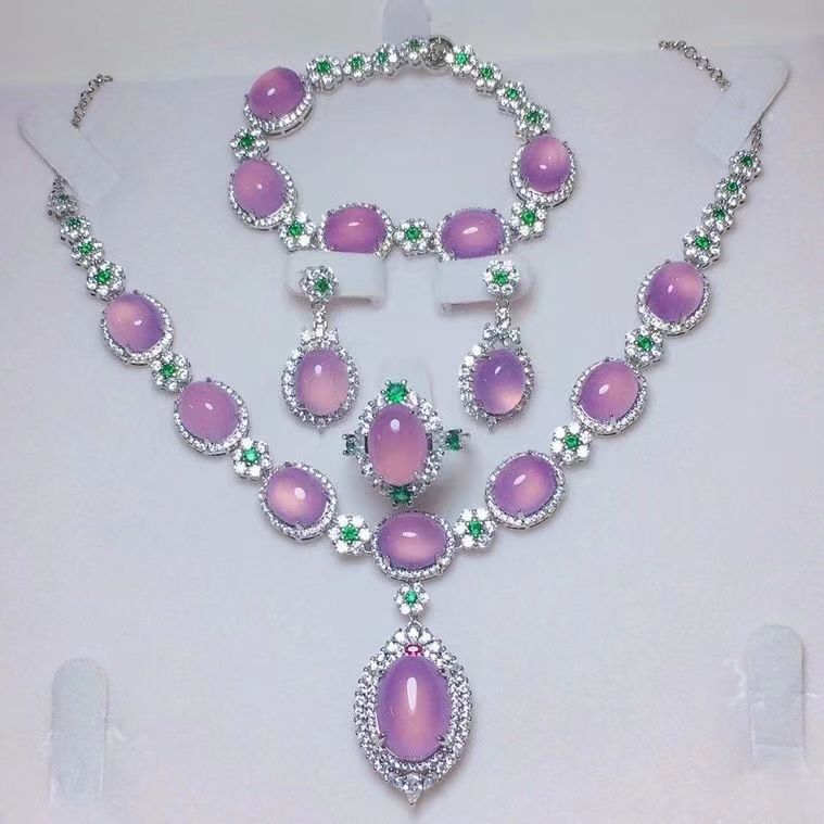 S925銀モザイク玉髄卵面ペンダント軽贅沢ファッション氷種玉髄四点セットイヤリング指輪ブレスレット