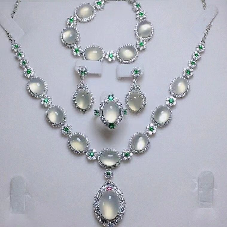 銀メッキ玉髄卵面ペンダント軽贅沢ファッション氷種玉髄四点セットイヤリング指輪ブレスレット
