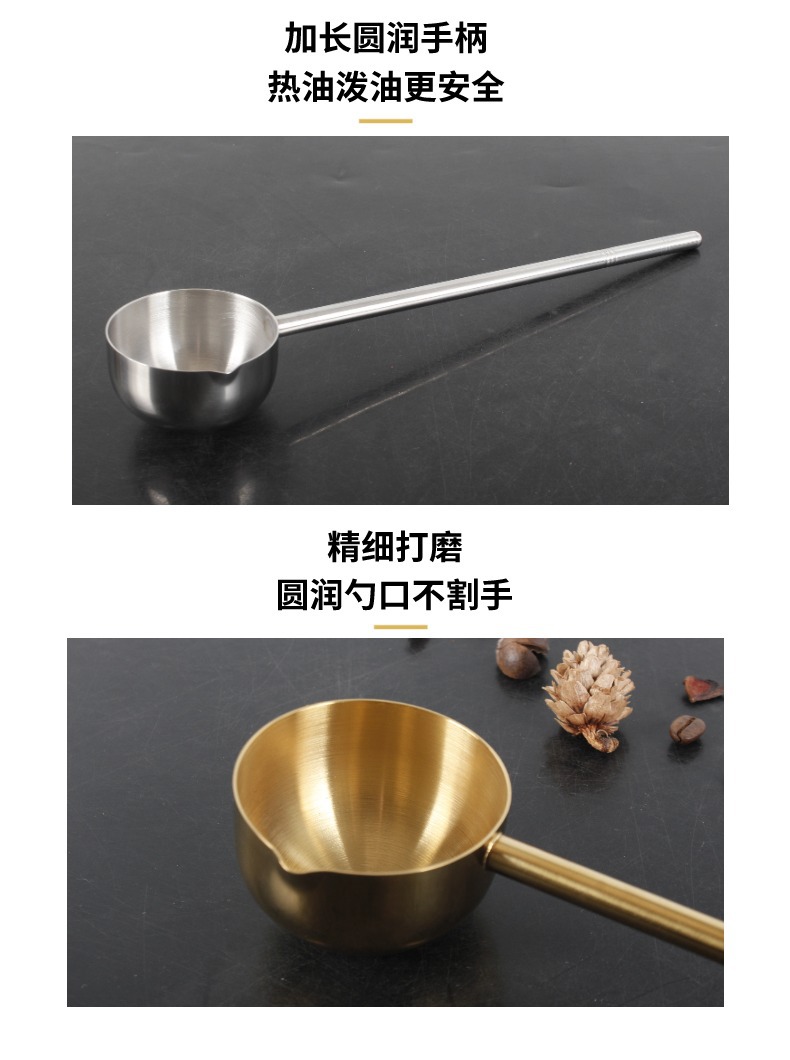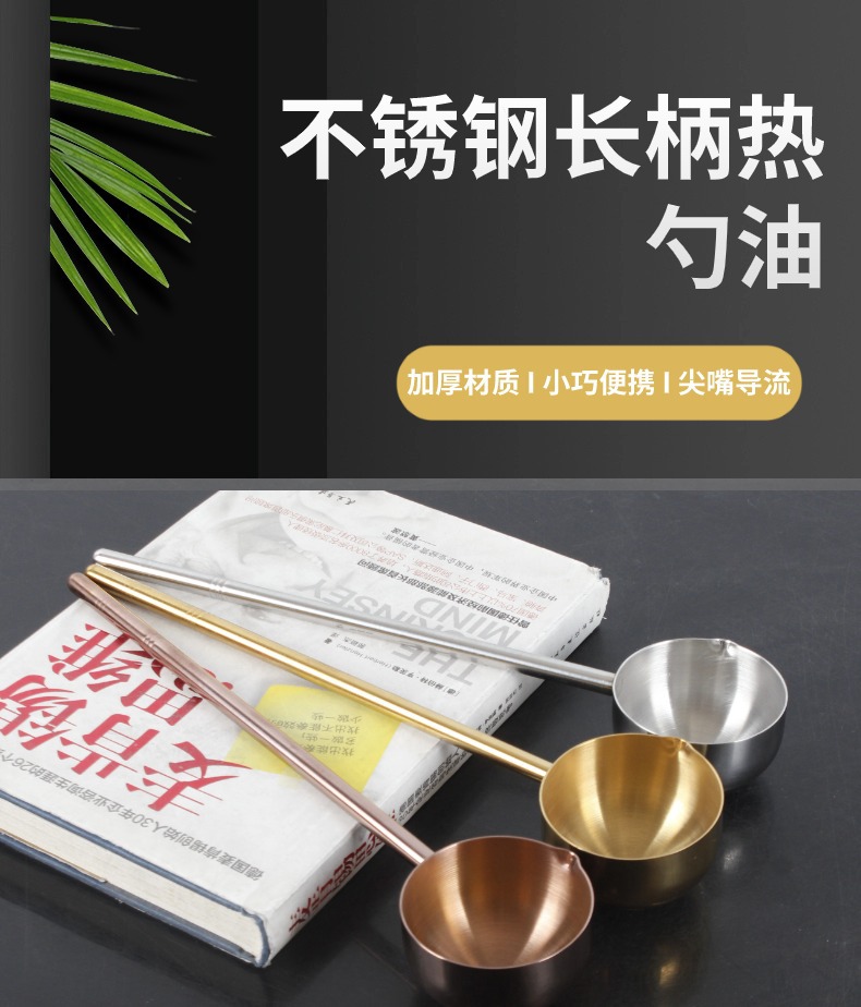 ステンレスの長い柄の家庭用スプーンは油をかけます。