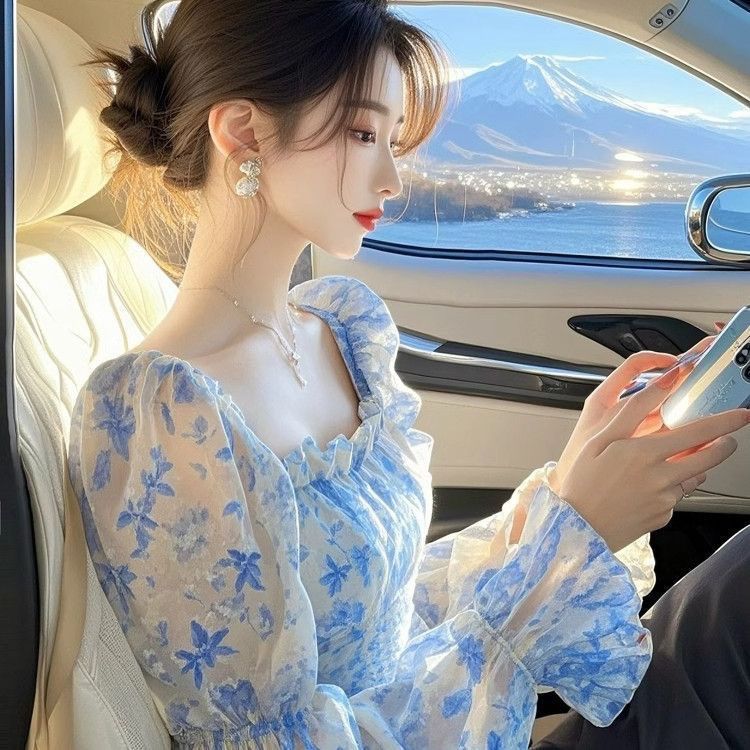 フランスの高級感の青い花の長袖のシフォンのシャツの女性の春の新型の軽くて贅沢な洋風のきれいで美しい上着