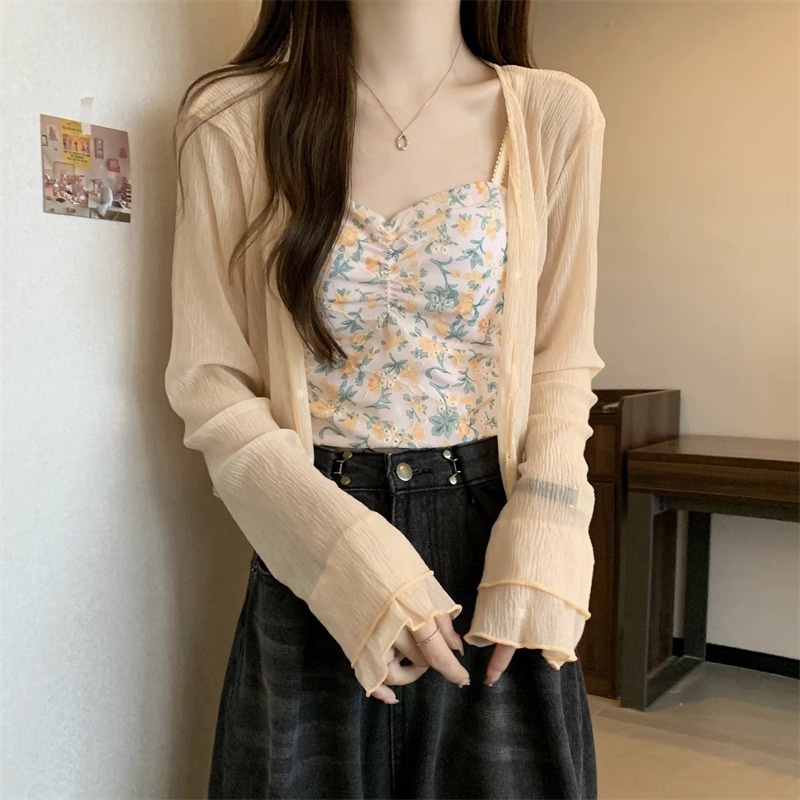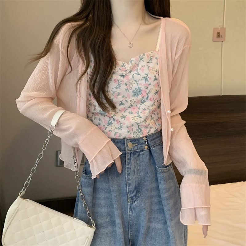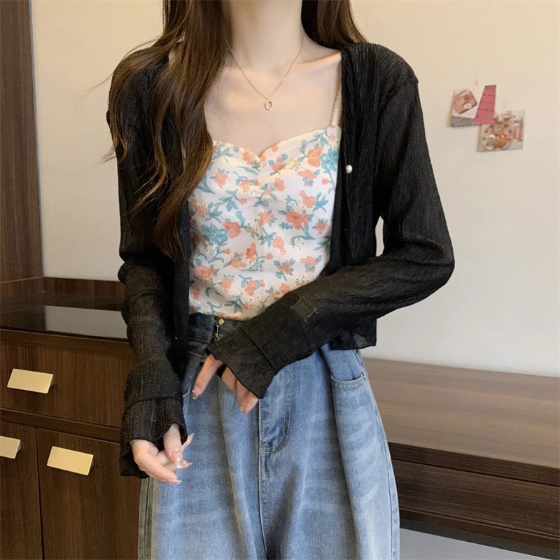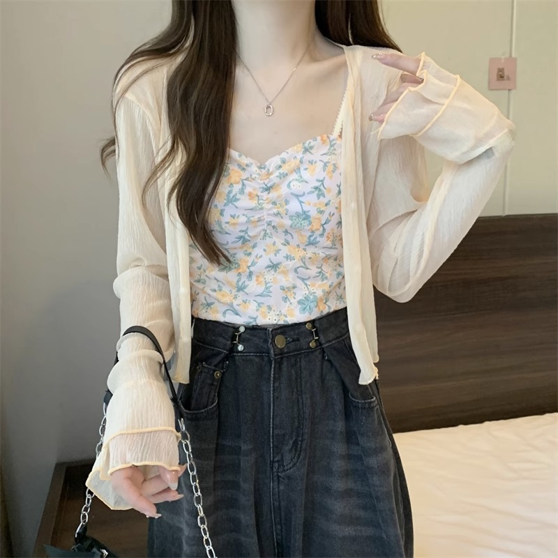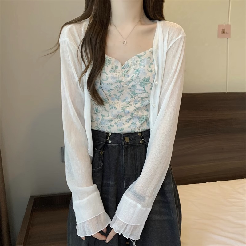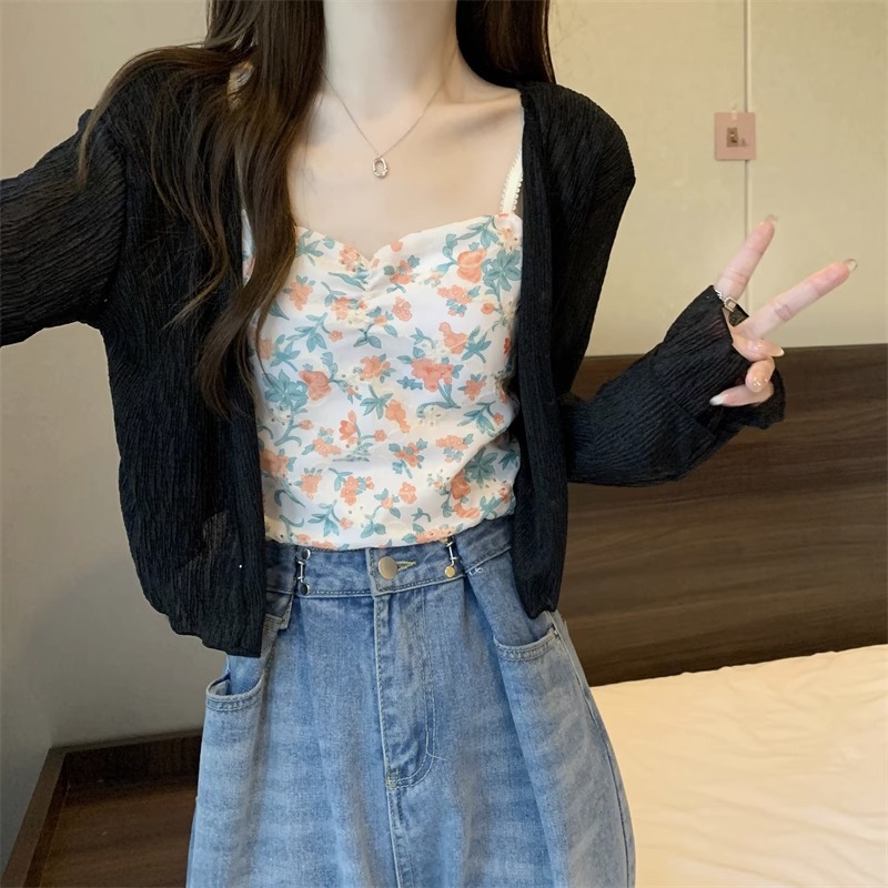 女性用フランス日焼け止めカーディガン、秋と夏のサスペンダースカート、ショールブラウス、小さなチョッキジャケット、気質