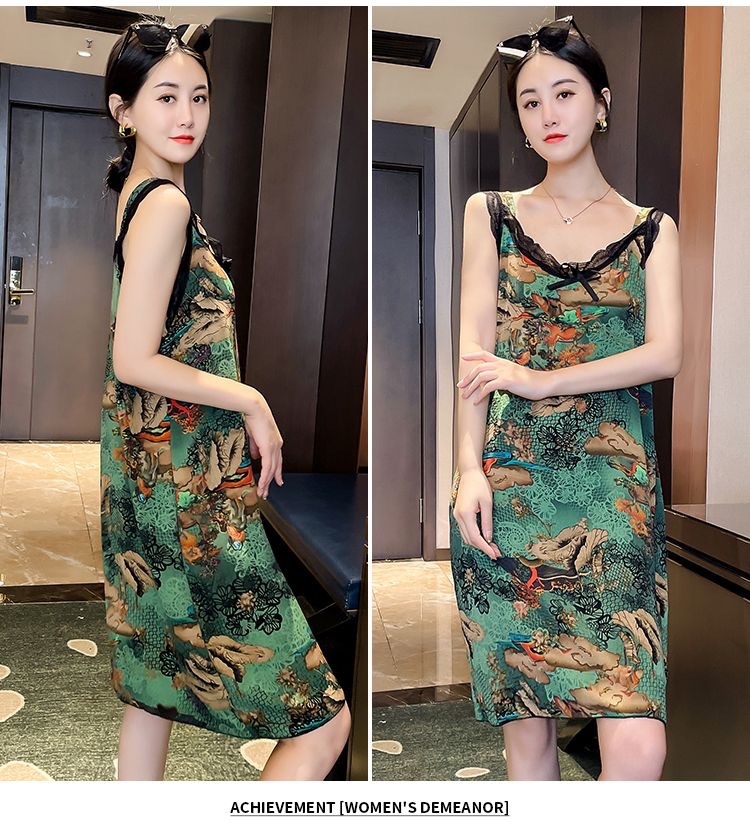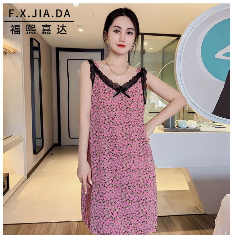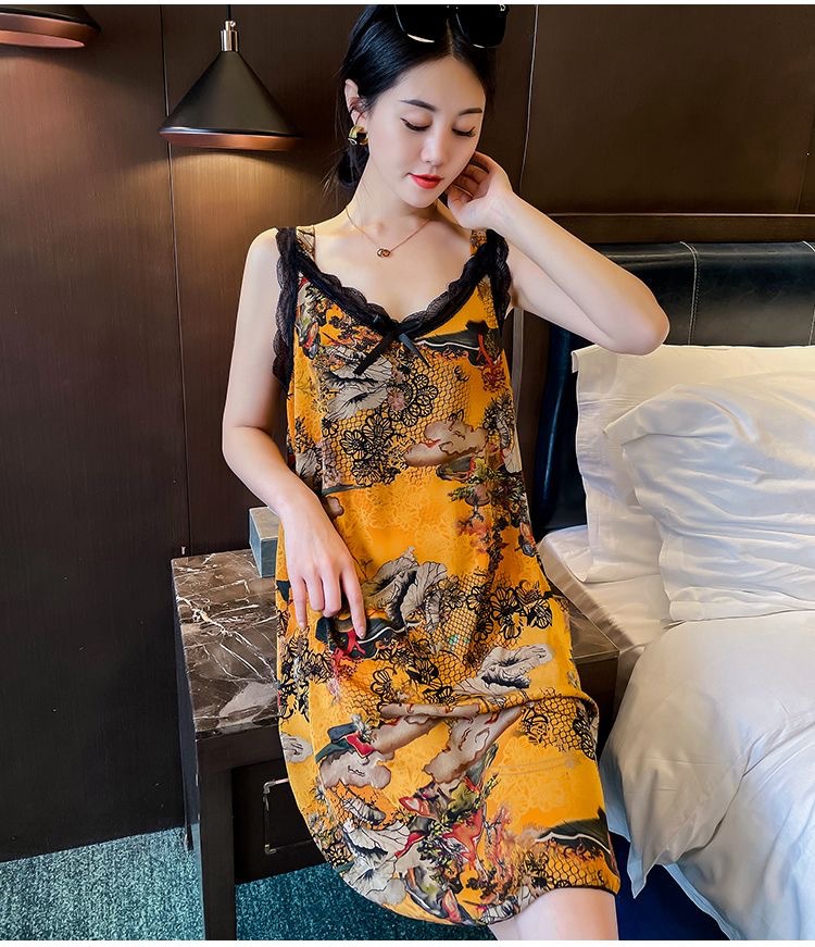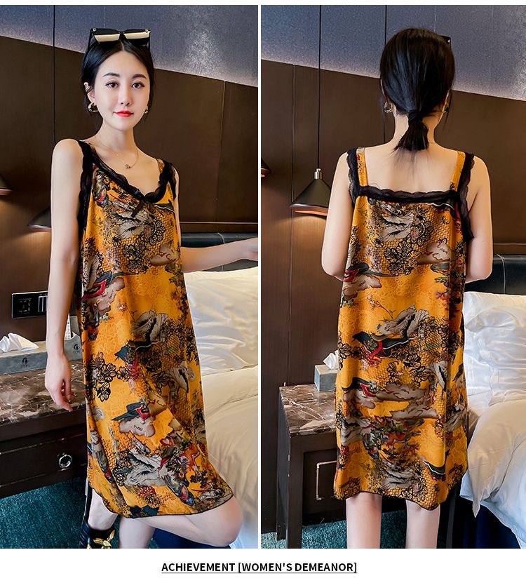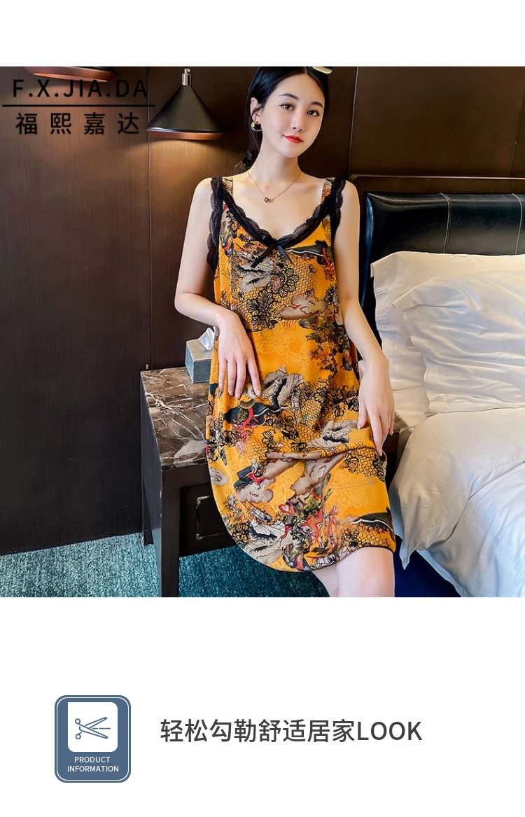 2025 最新 Fuxi Jiada アイスシルクサスペンダードレスセクシーなプリントレースアイスシルクマットスーツパジャマ