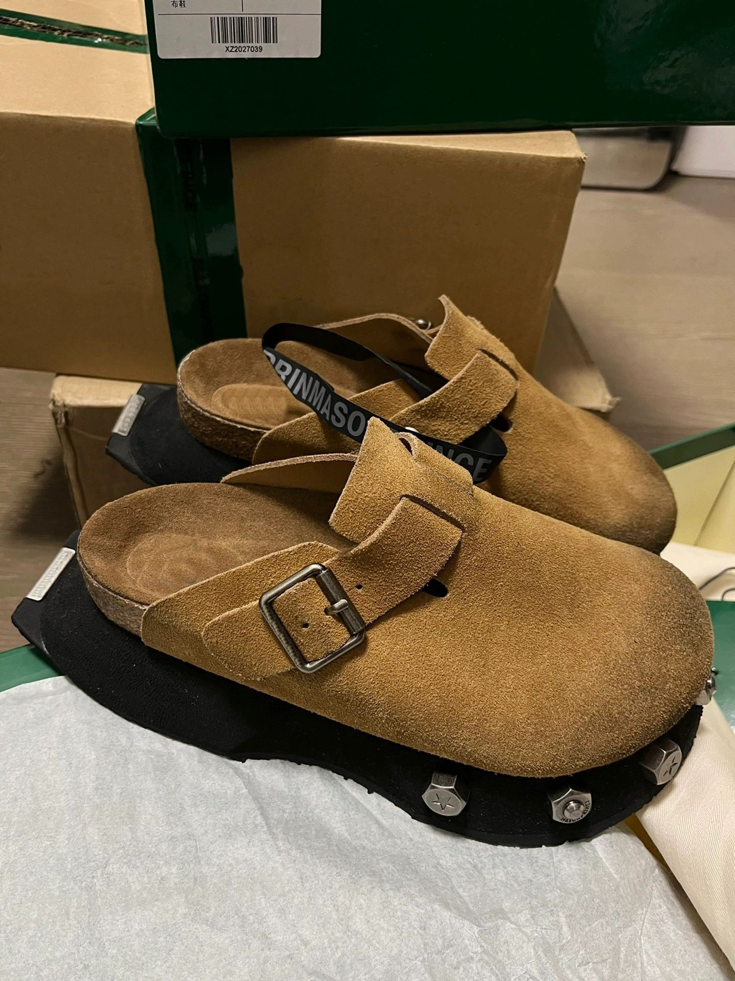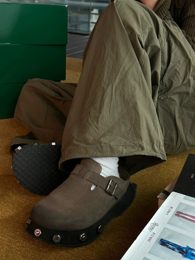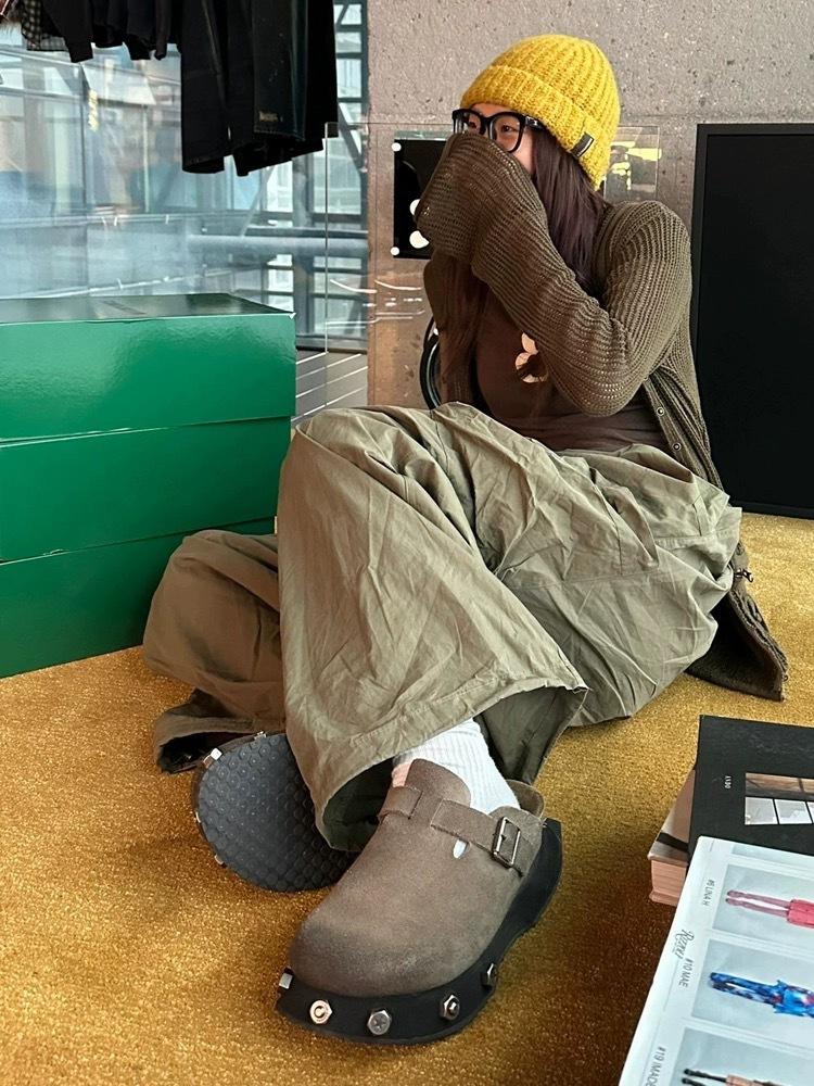 レトログレーブラウンビルケンシュトックシューズ超厚底本牛革つま先ハーフスリッパ2025新作リベットスリッポンハーフスリッパ