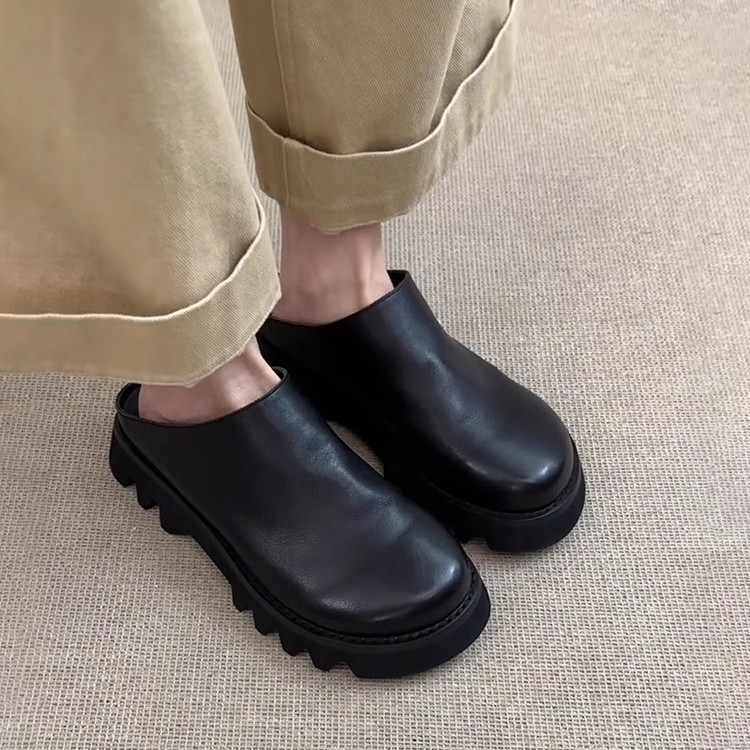 博ケン靴の女性2025の新型春夏の厚い底の復古の半スリッパの本革の1足は包頭のスリッパの女性を踏んで外に着ます。