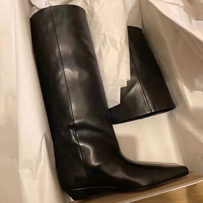 レトロナイトブーツ女性のための秋 2025 新しいポインテッドトゥウェッジヒールストレートハイブーツニーハイファッションブーツ