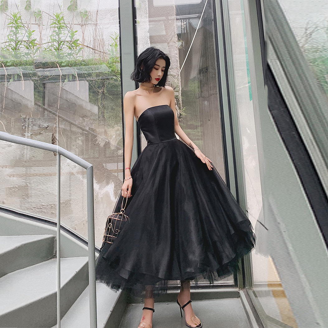 女性用宴会イブニングドレス 2025 新スタイル スリムパフスカート ブラックロングバースデーパーティー チューブトップドレス
