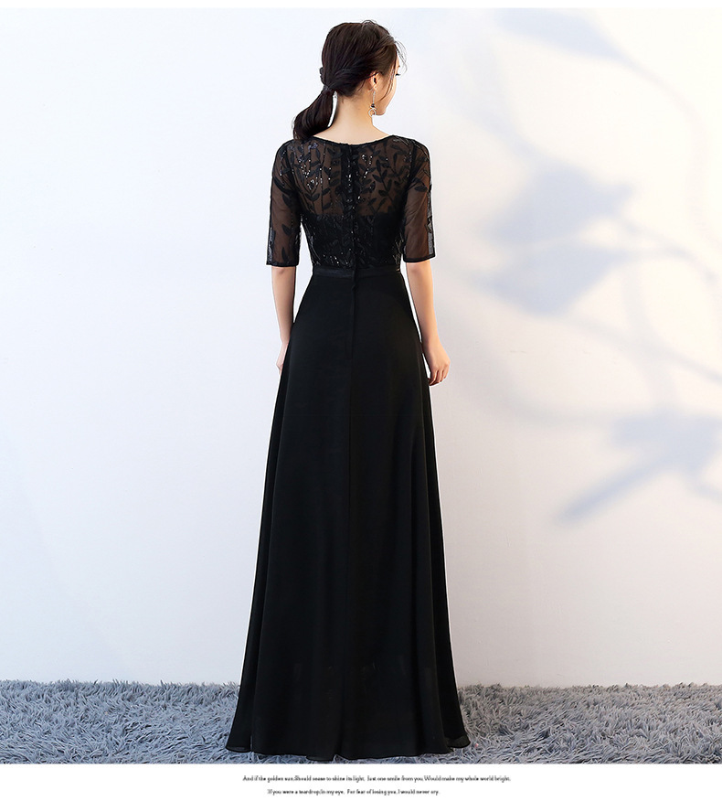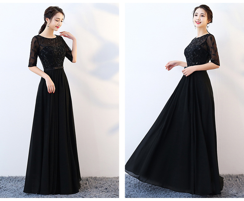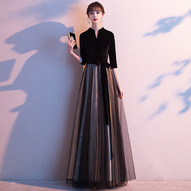 2025年秋新作 レディースイブニングドレス 気品漂う社交界の長袖ブラック合唱演奏会ドレス