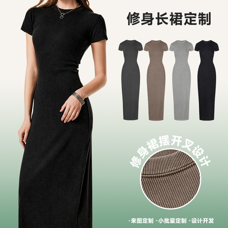 2025冬欧美长款修身显瘦长裙针织短袖连衣裙简约叉螺纹包臀裙女装