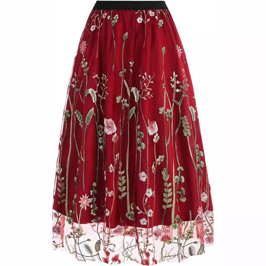 2024新型女性気質半身スカートレトロカジュアル修身花卉薄紗刺繍トランペットスカート