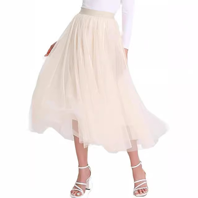 2024新型女性用薄紗スカートの中の長さの弾力性の高い腰のしわの網の目が漂っているa字型の蓬蓬のスカート